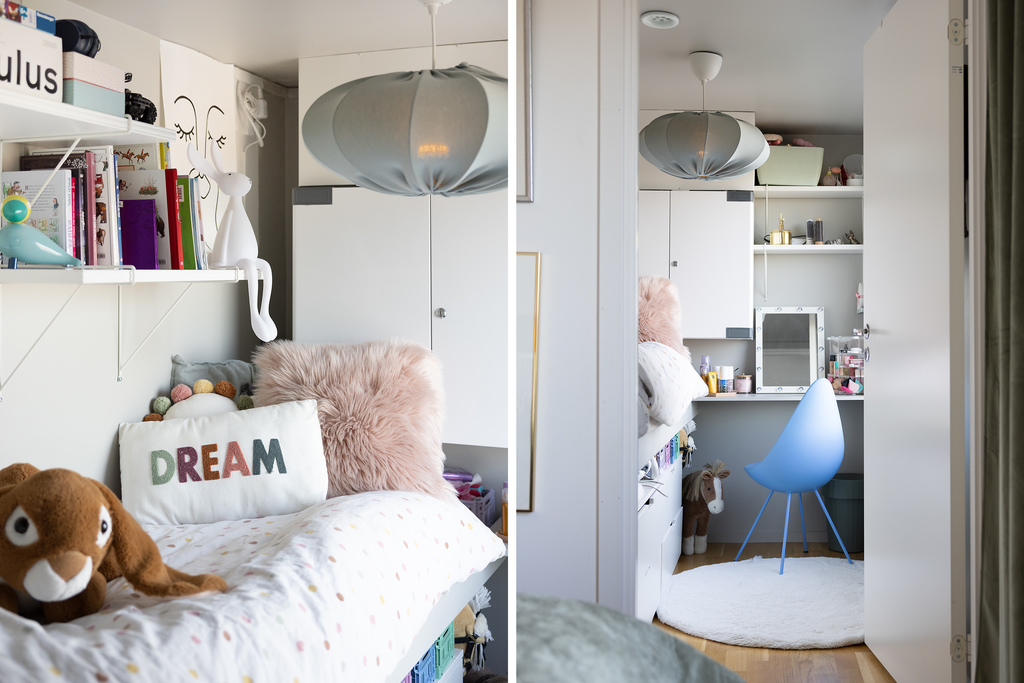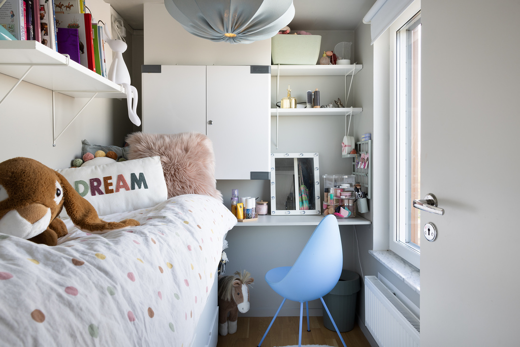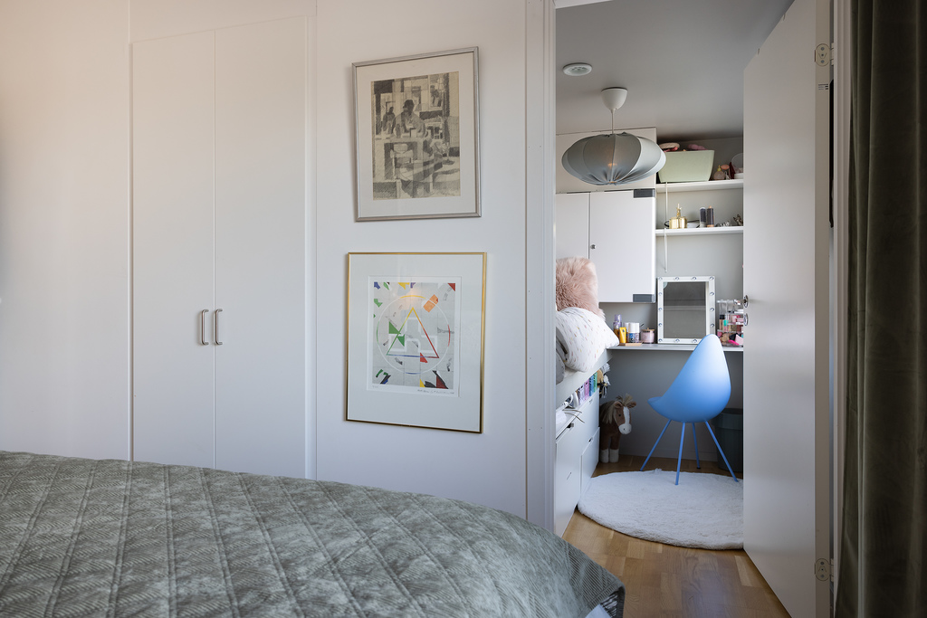 Lägenhetens klädkammare/förråd fungerar idag som ett kompakt sovrum för minstingen i familjen med platsbyggda smarta lösningar. (Inredningen kan lämnas kvar om så önskas.)