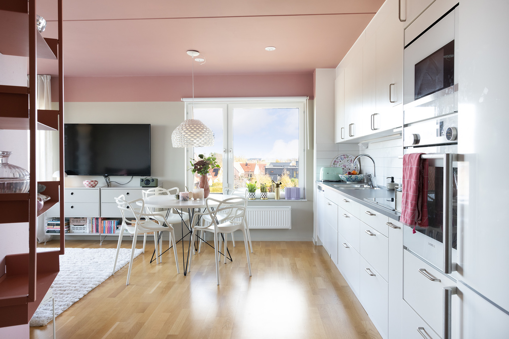 Mellan kök och vardagsrum finns en perfekt plats till att placera ett rejält matbord vilket samtidigt bildar en naturlig uppdelning av den öppna planlösningen - ett rum i rummet.
