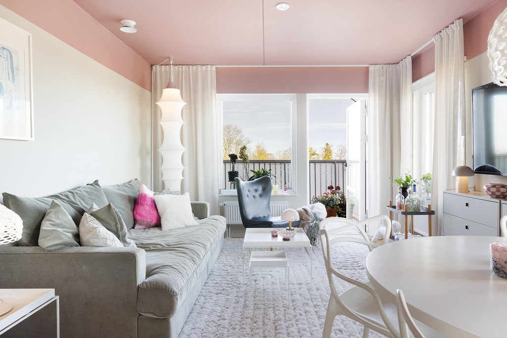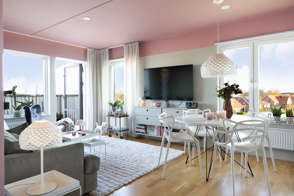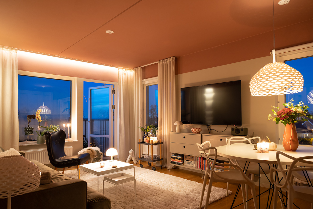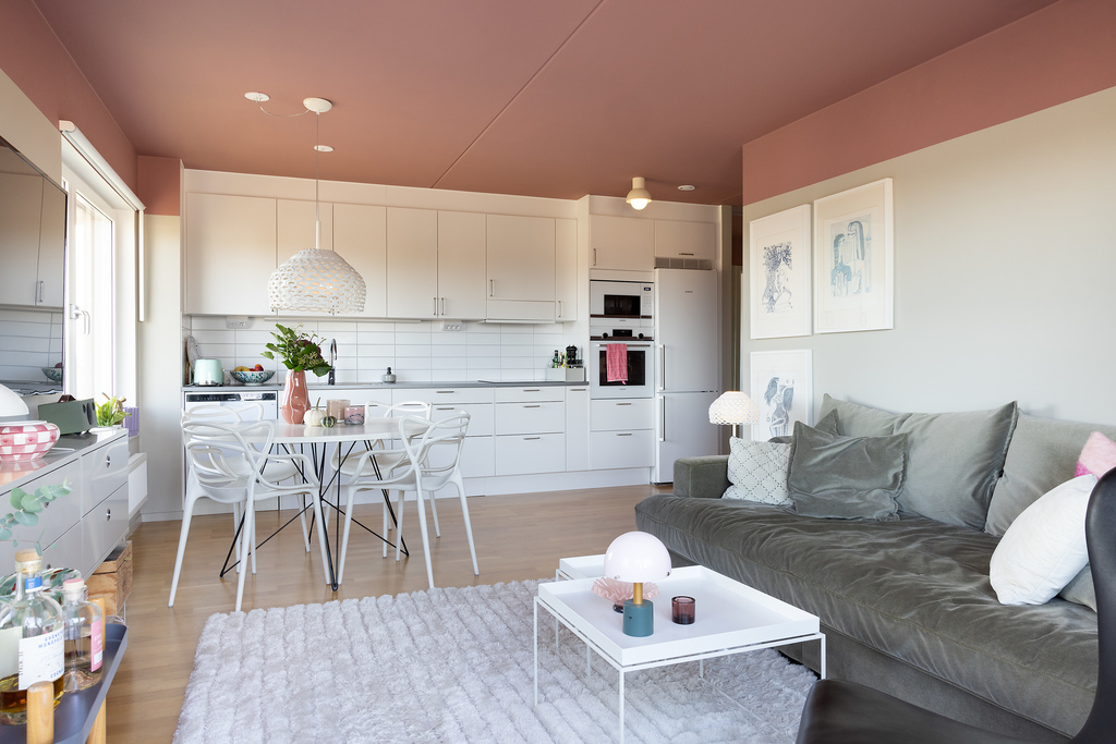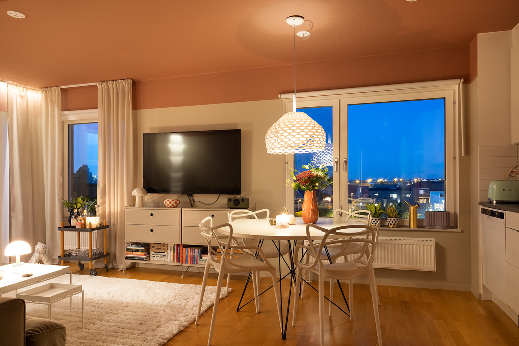 Vardagsrummet erbjuder ett fantastiskt ljus tack vare generösa fönsterpartier i två väderstreck, samt utgång till balkongen. Öppen planlösning mot köket ger sociala ytor att umgås på. Gott om utrymme till soffgrupp och mediemöbel plus att det mot köksdelen finns utrymme till matplats. Väggar och tak är målade i kontrasterande nyanser vilket ger en härlig dimension till rummet. Som golv ligger ekparkett vilket är genomgående i hela lägenheten.