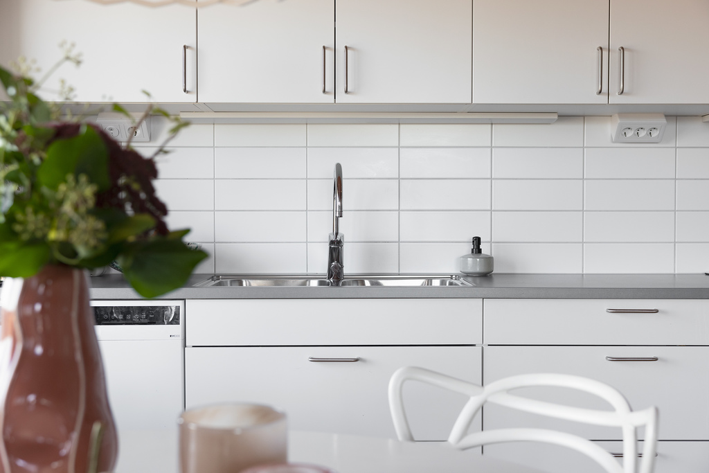 Köksinredning går i klassisk och tilltalande vit nyans som snyggt harmoniserar med det vita kaklet ovan och kontrasterar mot den grå bänkskivan. Köket är fullutrustat med induktionshäll, inbyggd varmluftsugn och micro i praktisk arbetshöjd, köksfläkt, diskmaskin samt kyl/frys.