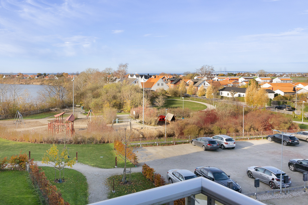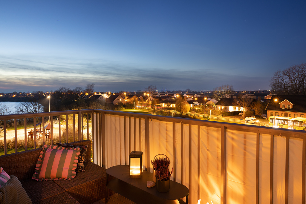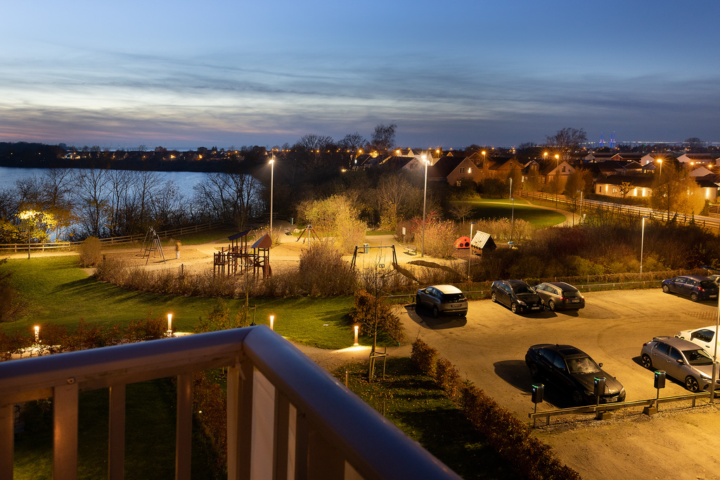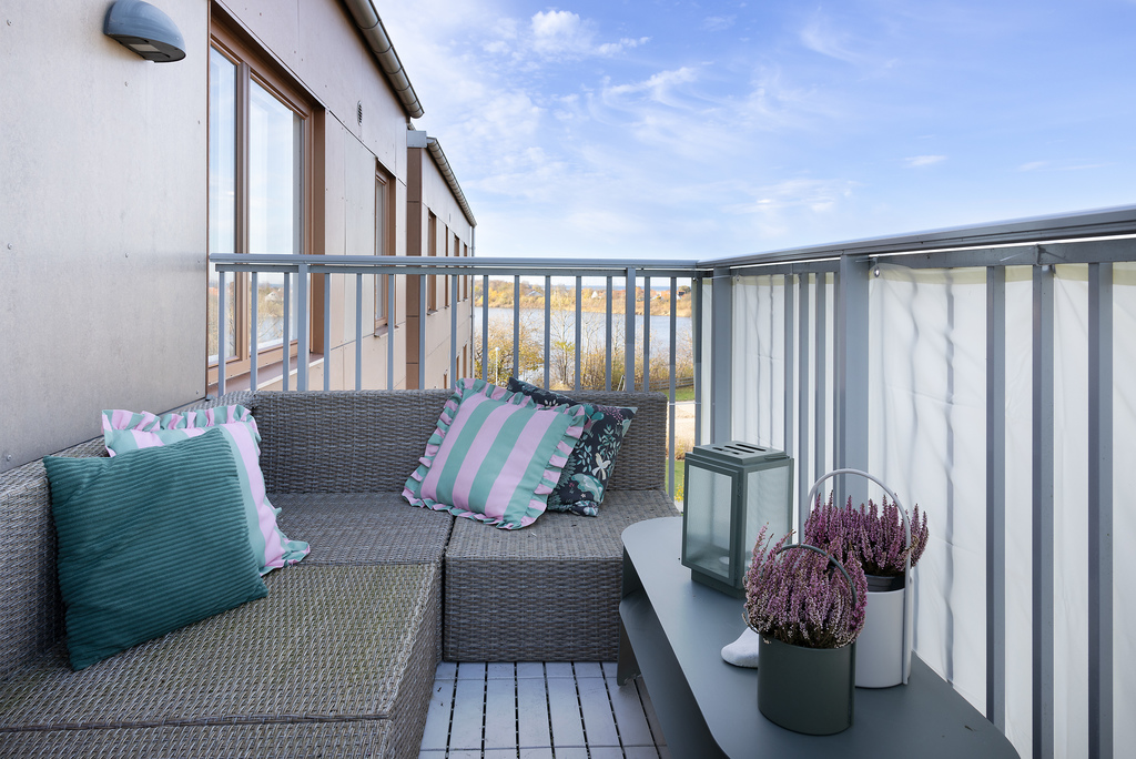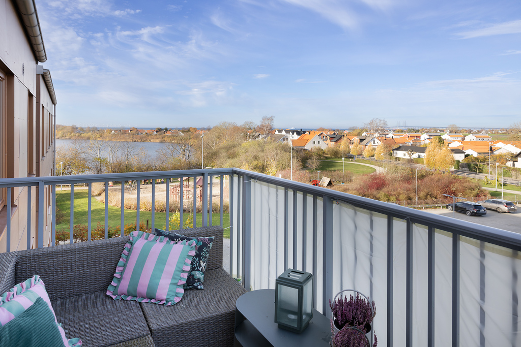 Väl tilltagen balkong, med västersol, som enkelt går att möblera med loungedel eller matplats om så önskas. Obruten utsikt över Kalkbrottssjön och Öresund i väster där solnedgången kan avnjutas. I norr ges utsikten in över Malmö och i öster över villakvarteret och de närliggande åkrarna. Här kommer många sommardagar, och kvällar, spenderas!
