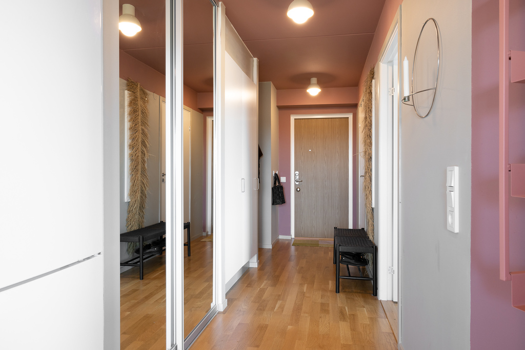 Direkt när man kliver över tröskeln till lägenheten slås man av den trevliga siktlinjen via kökets fönster i öster. Entrén är välkomnande och erbjuder goda avhängninsmöjligheter plus massor av förvaring i en bred skjutdörssgarderob samt en rymlig dubbelgarderob som tillsammans löser den praktiska frågan kring extrakläder och skor.