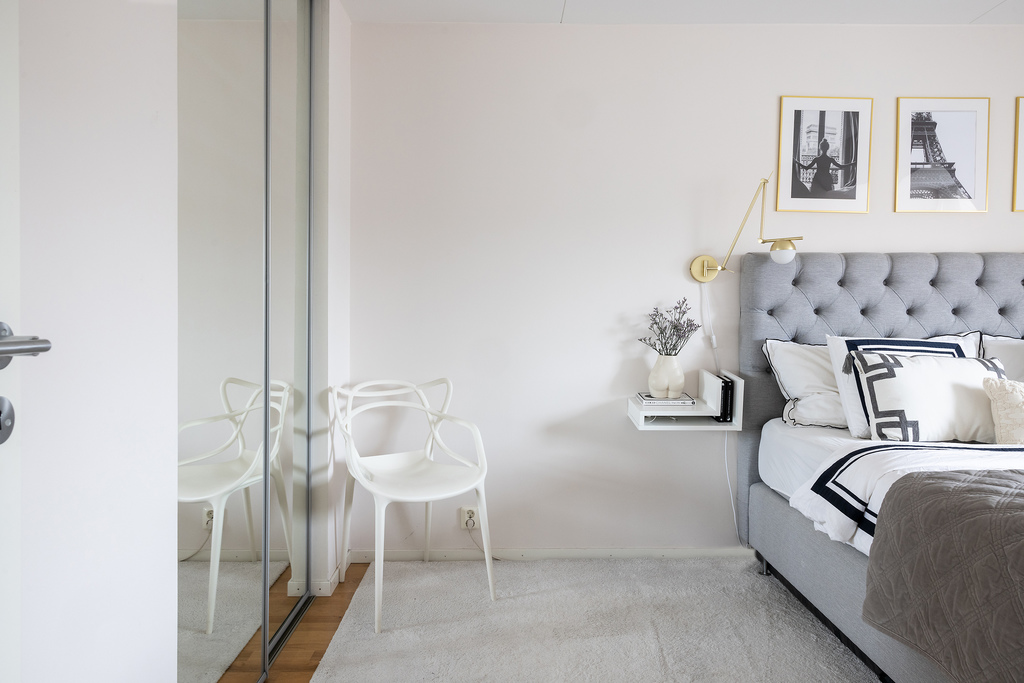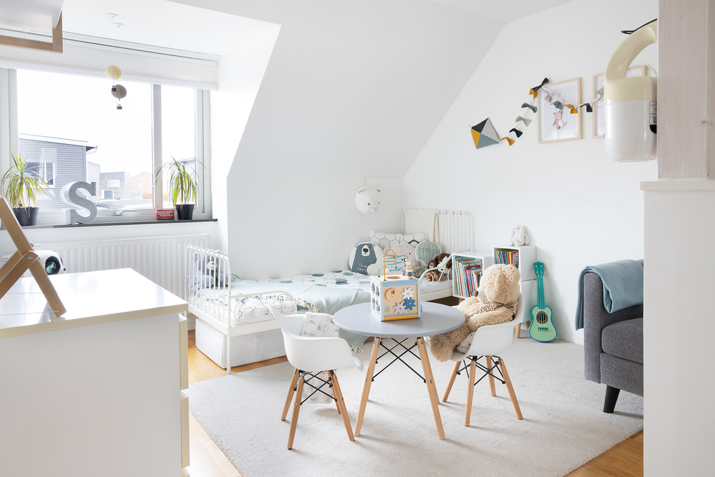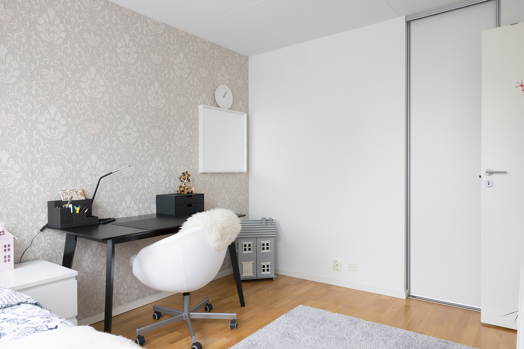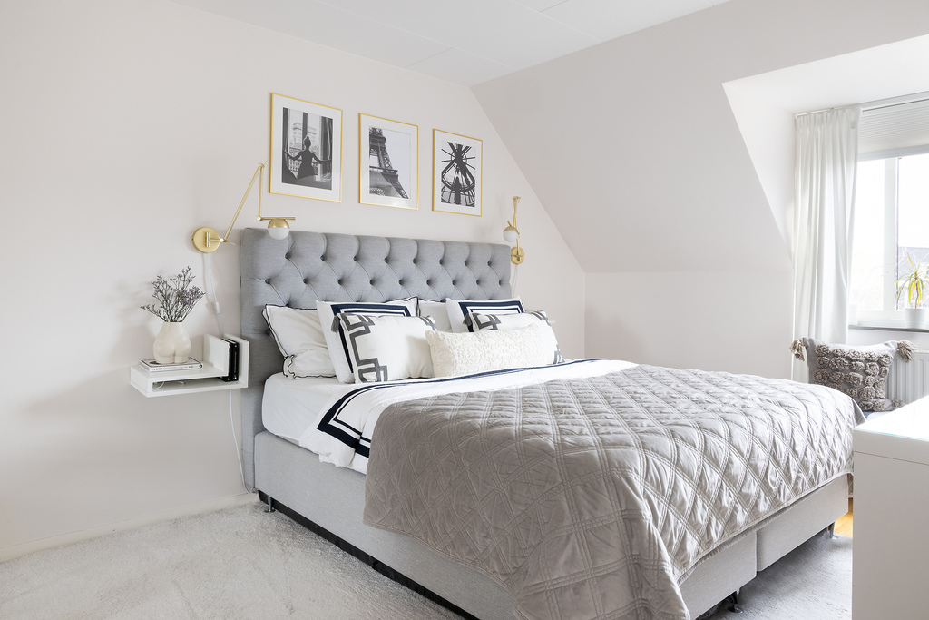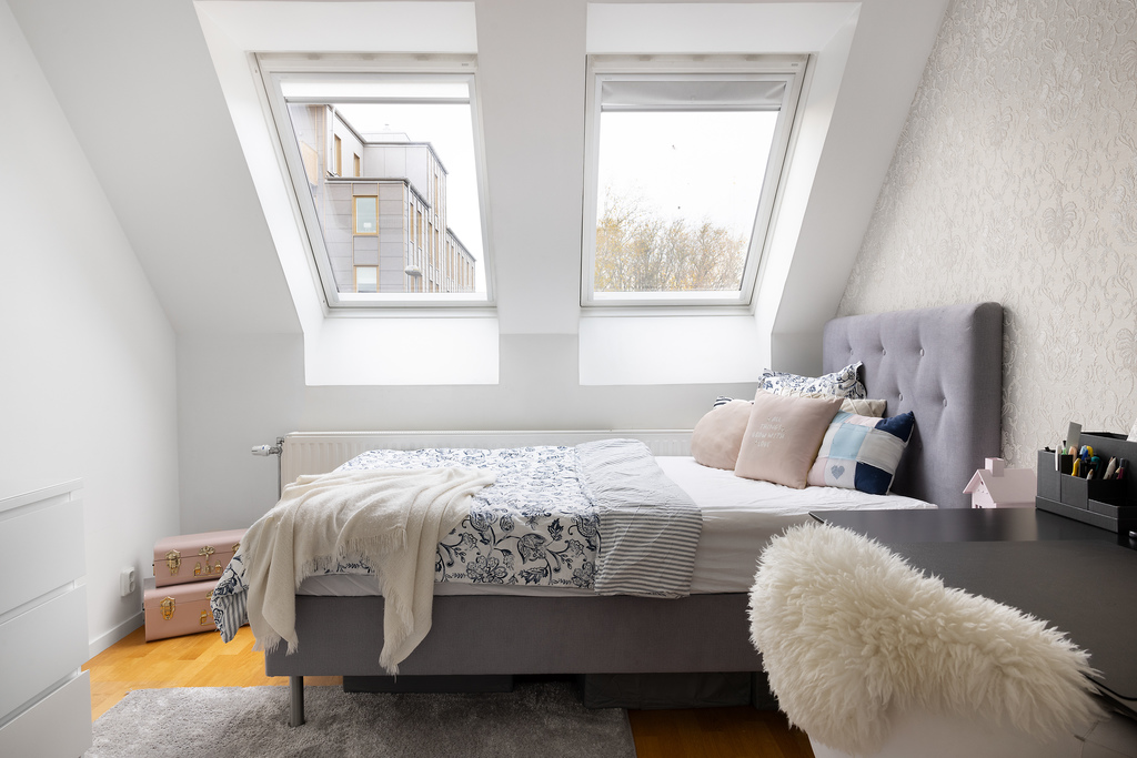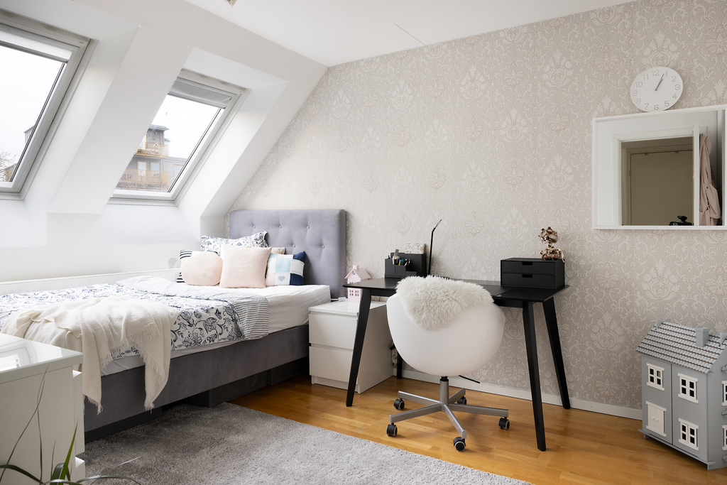 Sovrum nummer två är det största rummet (drygt 14 m²) och tänkt som husets Master bedroom. Även här finner vi en inbyggd skjutdörrsgarderob till förvaring och takkupa med fönster mot baksidan, vilket ger både extra yta och bra med ljus.
