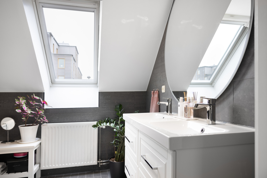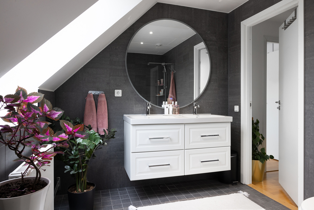 Badrummet på husets övre plan är bra tilltaget till ytan och går i samma gråa nyanser som badrummet i entréplanet - enhetligt. Här finns ett fristående badkar med skyddande glasvägg, wc, dubbla handfat med kommoder, en stor rund väggspegel samt infällda spotlights i taket. Takfönster som erbjuder dagsljusinsläpp och vädringsmöjligheter.