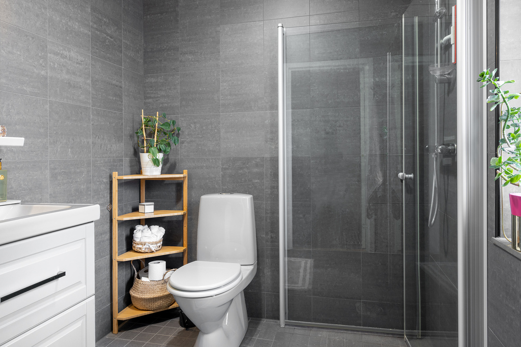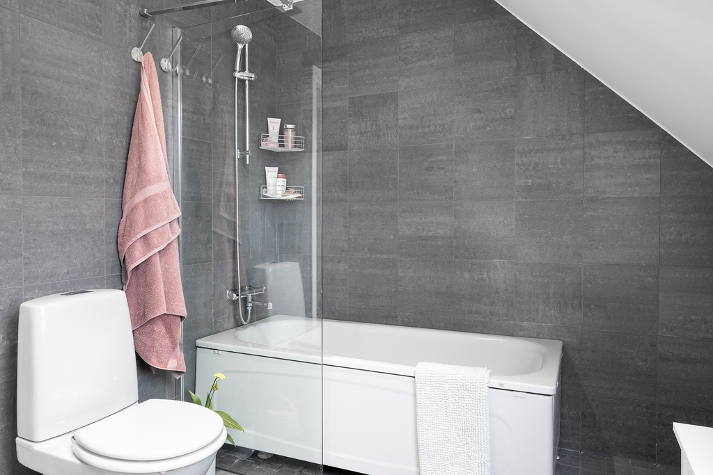 Inbjudande och enhetlig grå färgskala på både både kakel och klinker samspelar med den vita badrumsinredningen från Vedum. Duschhörna med infällbara glasdörrar som kan vikas undan när duschen inte används och på så sätt ge mer golvyta att röra sig på. Handfat med kommod, vägghängd spegel med infälld belysning, wc och vattenburen golvvärme som är varmt och skönt för bara fötter under kalla vintermorgnar. Frostat fönster låter dagsljuset stråla in samtidigt som det erbjuder vädringsmöjligheter efter den varma duschen.