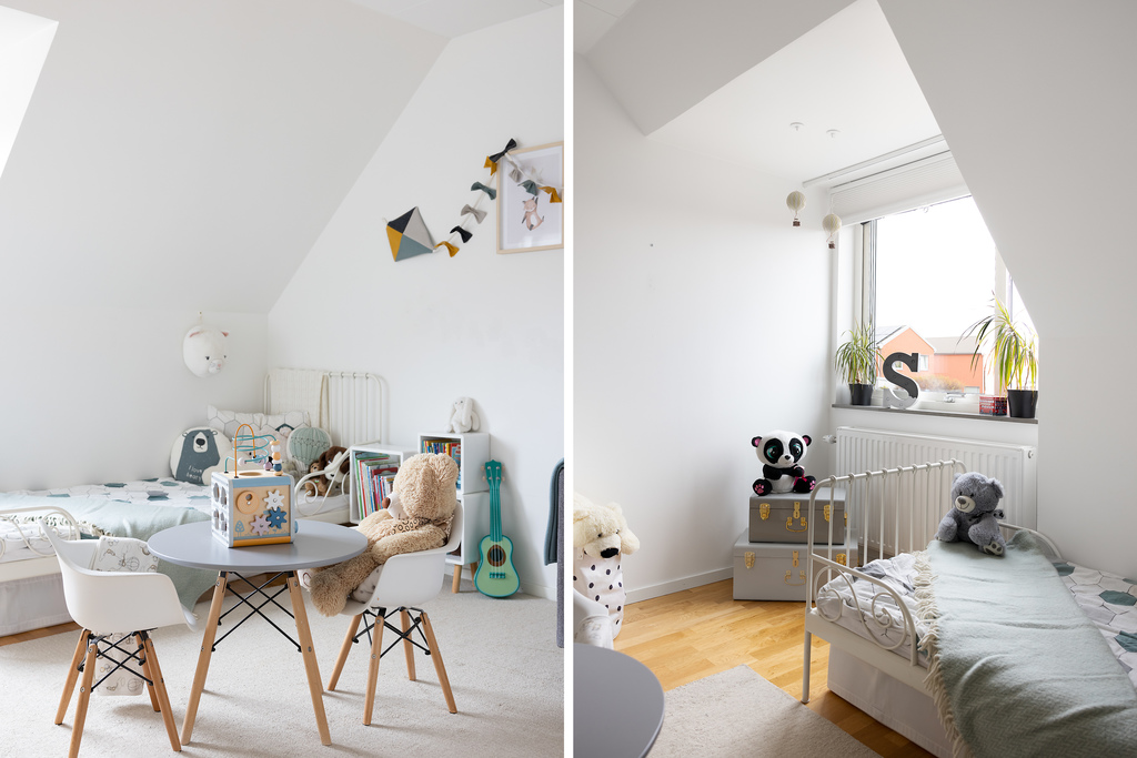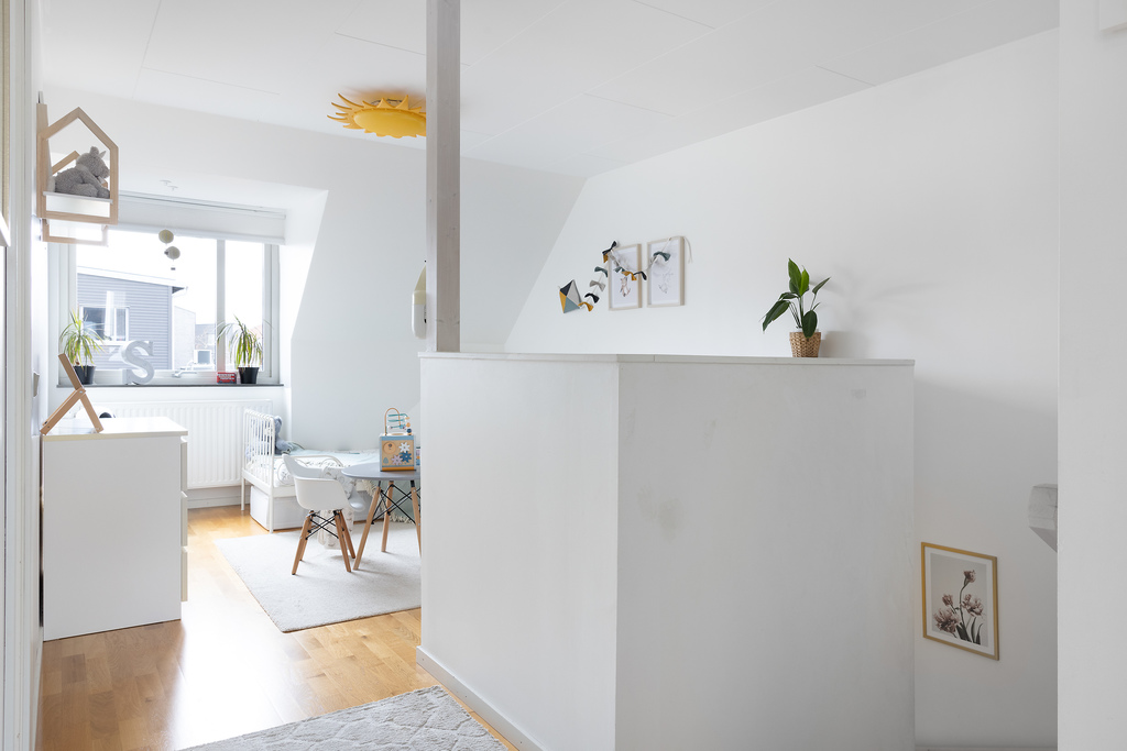 Sovrum 2 ( ca 12,5 m²) är beläget mot framsidan av huset och får bra med dagsljus tack vare två stora, och öppningsbara, takfönster. Samma parkettgolv som är genomgående i hela huset och väggarna är målade i vitt. Förvaringen löses genom en inbyggd skjutdörrsgarderob.