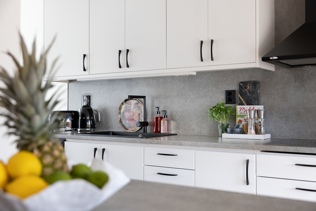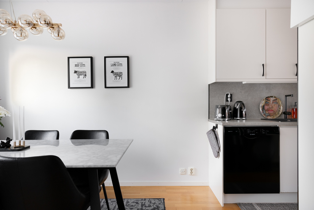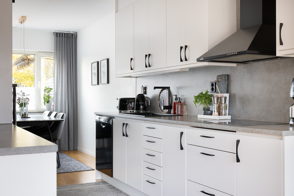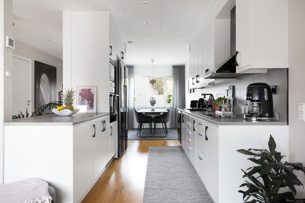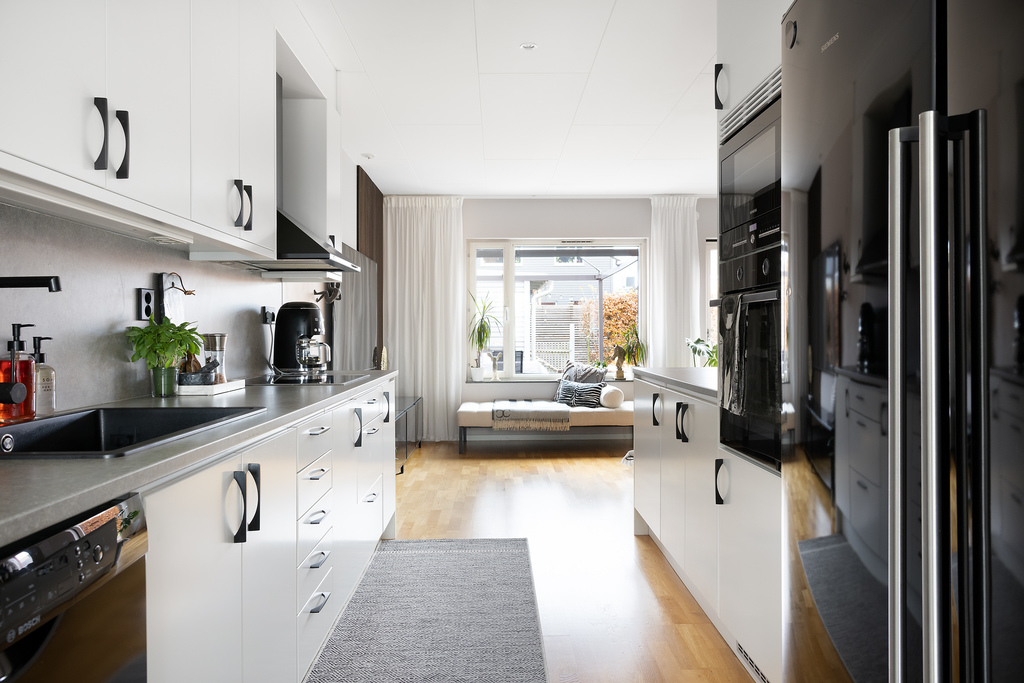 Köket ligger behagligt öppet mot vardagsrummet med inredning från Vedum i klassiskt vitt - planerat på två sidor av rummet vilket ger både fina arbetsytor och gott om skåpsutrymme. En halvö öppnar upp mot sällskapsytorna och blir en utmärkt serveringsyta såväl som extra arbetsyta. Fullt utrustat med kyl och frys i fullstorlek, diskmaskin, inbyggd ugn och mikrovågsugn i praktisk arbetshöjd, induktionshäll samt spisfläkt. Hela maskinparken är i svart utförande som kontrasterar mot inredning och harmoniserar med den grå bänkskivan. Vita och väggar och samma fina parkettgolv som följer oss obrutet ut i vardagsrummet.