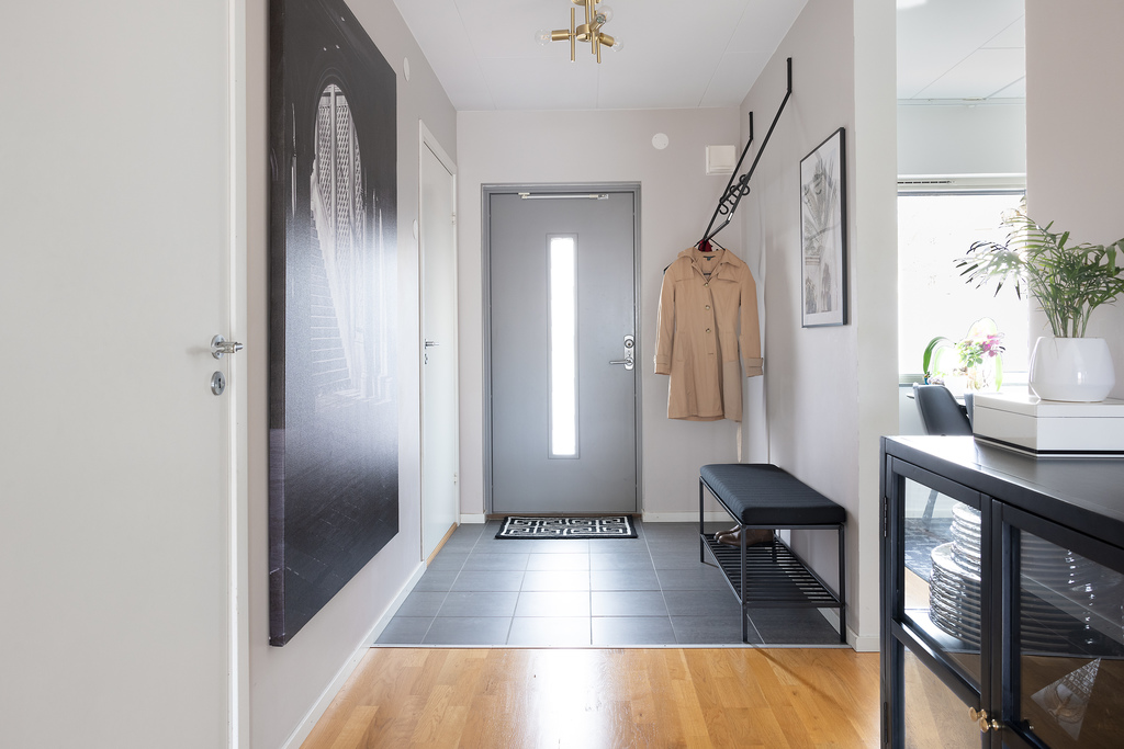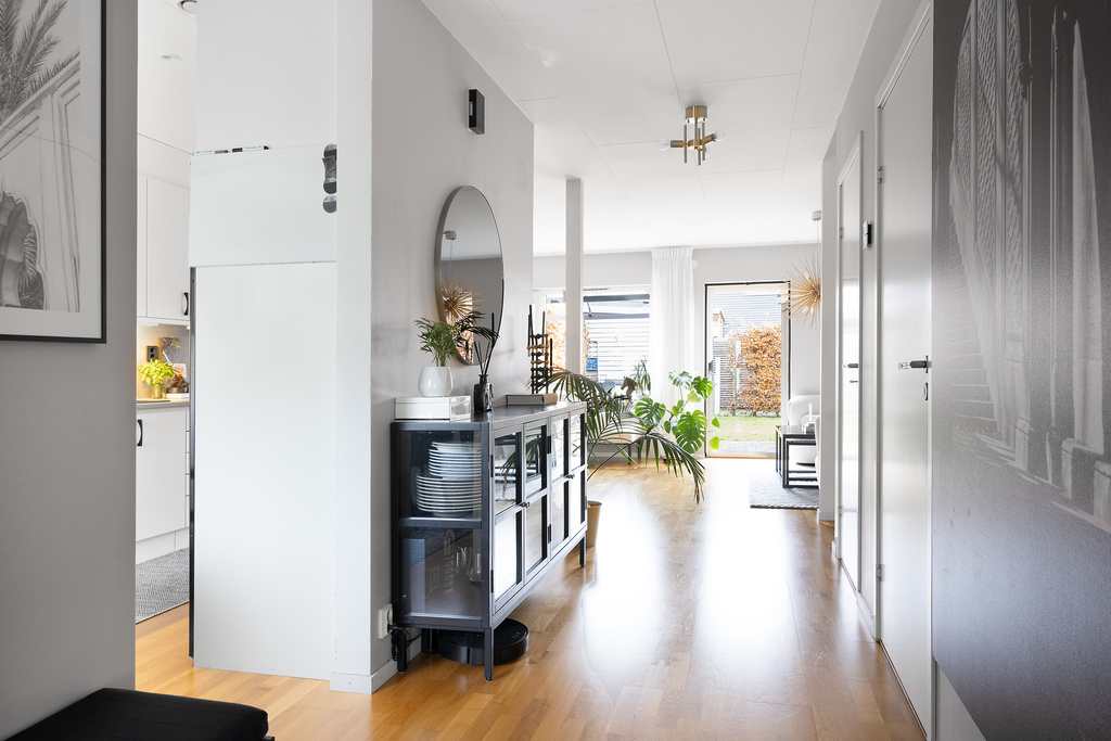 Direkt innanför entrédörren slås man av en fantastiskt härlig fri siktlinje, från hallen via vardagsrummet rakt ut i trädgården vilket ger ett underbart ljusflöde. Entréhall välkomnar in genom dörr med fönster och praktiskt klinkergolv samt plats för avhängning av ytterkläderna. Hallen leder vidare in till öppen och ljus passage mellan vardagsrum och kök - härifrån går trappan upp till ovanvåningen och under denna finns ytterligare förvaringsyta i ett förråd som kan nyttjas till allt från skafferi till mysig koja för barnen.
