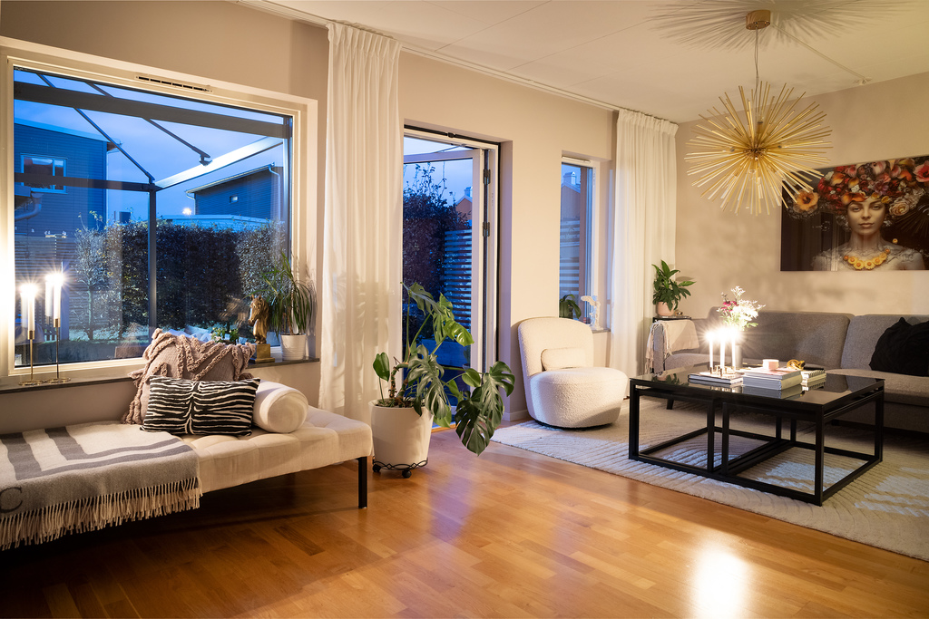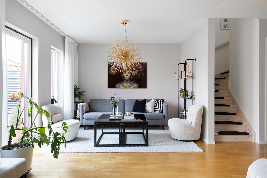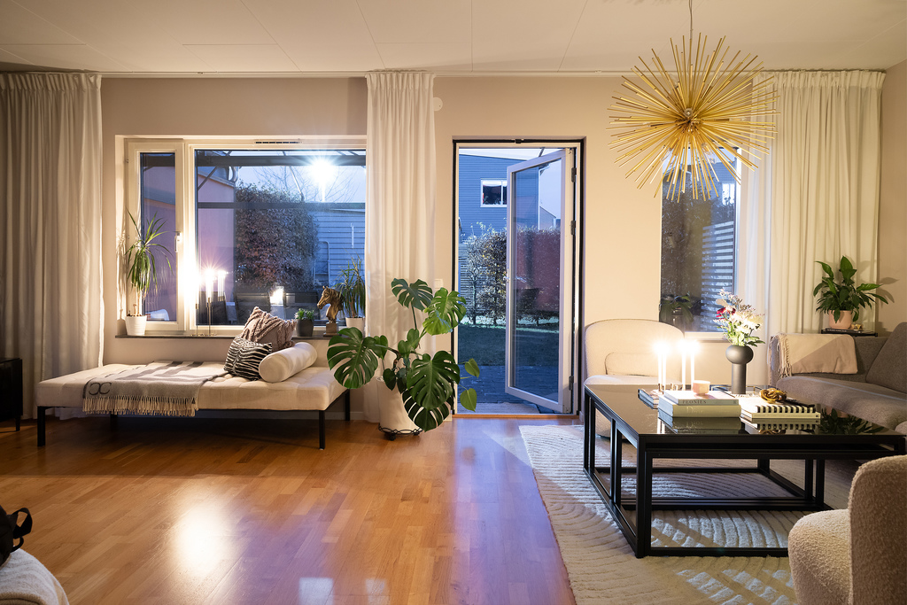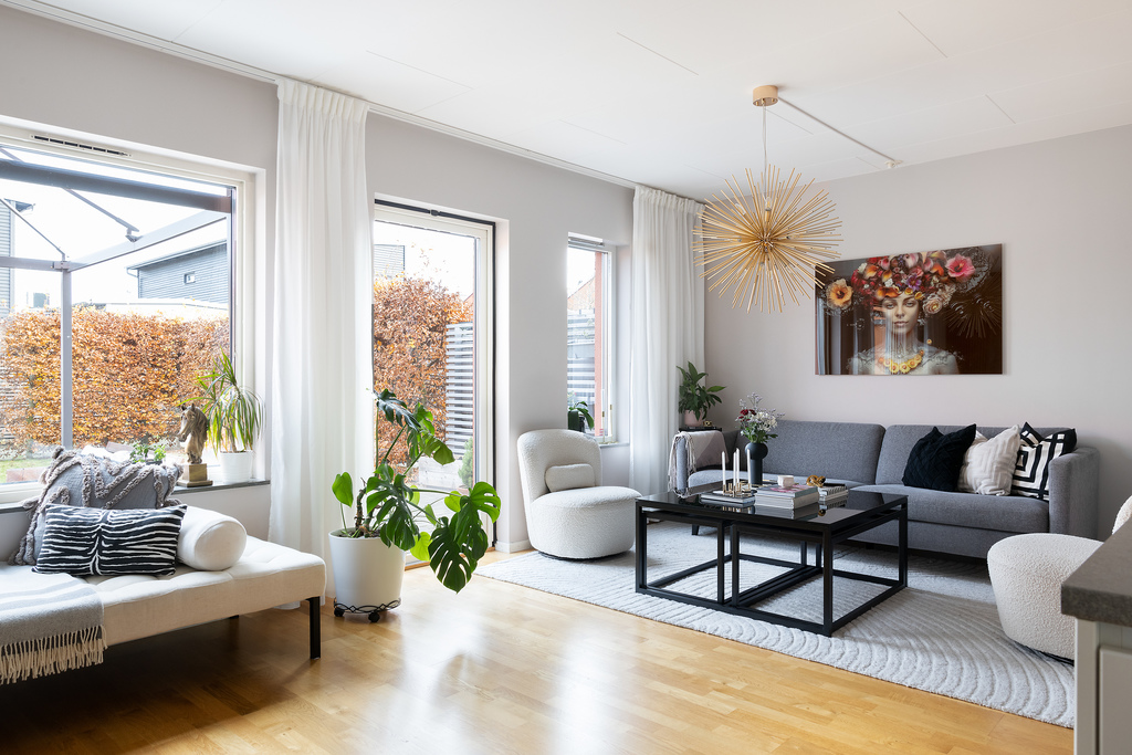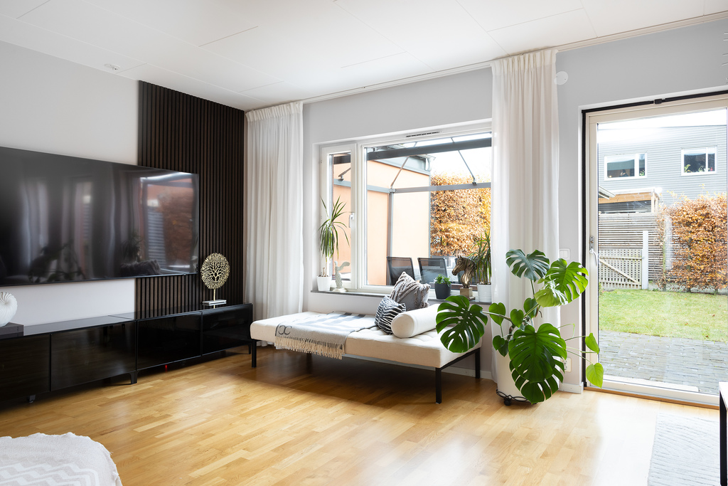 Luftigt och inbjudande vardagsrum som sträcker sig över hela husets bredd. Härliga sällskapsytor där den öppna planlösningen och angränsande kök ytterligare bidrar till rymdkänslan och passar lika bra till vardags som till fest - fina sociala ytor där hela familjen kan vistas tillsammans men ändå var och en syssla med sitt. Behagligt ljusinsläpp genom stora fönsterpartier samt glasdörr som vetter ut mot terrassen och trädgården utanför. Arkitekten som ritade huset har tänkt till och förberett för en möjlighet att dela av det stora rummet för att på så sätt få till en sovalkov eller kanske ett arbetsrum - något som gör att huset kan anpassas efter sin ägare och även kan rymma den stora familjen. Ekparkett på golvet och vita väggar.