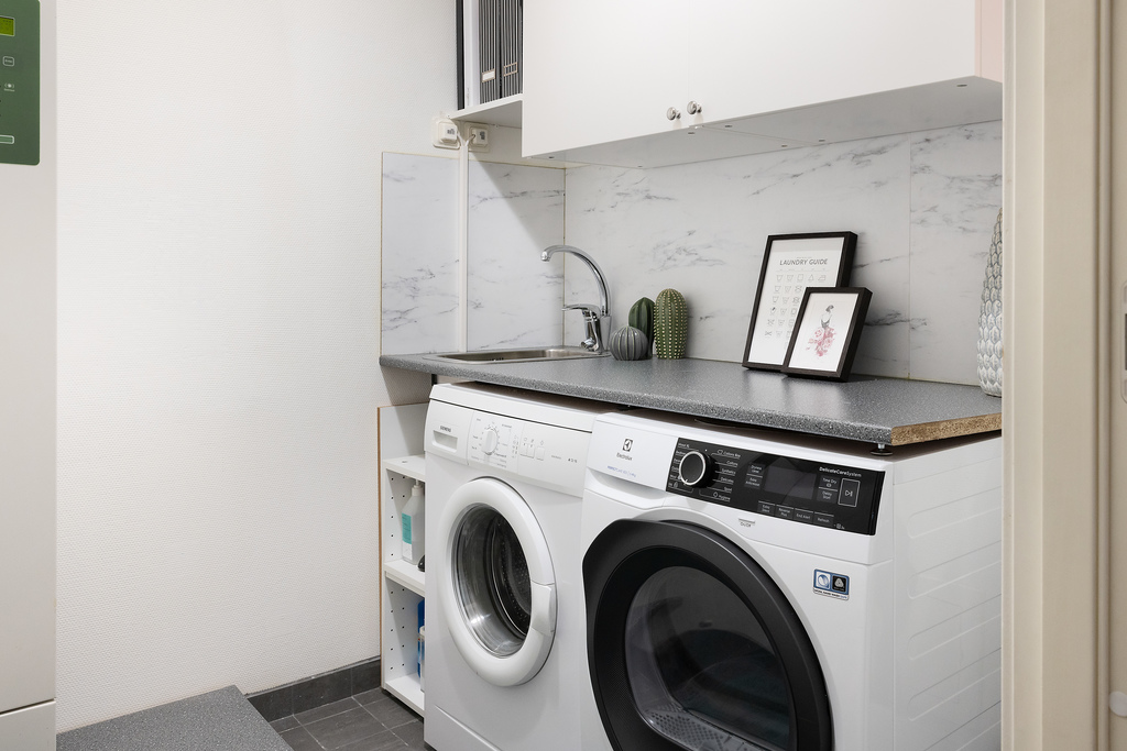 En separat tvättstuga med egen ingång från hallen ger ett bekvämt eget rum för tvätt utan att behöva dela utrymme med badrummet. Tvättmaskin och torktumlare med praktisk arbetsbänk innehållande vask för grovrengöringen. Ovan densamma finns två väggfasta skåp till förvaring. I tvättstugan huserar dessutom husets värmepump.