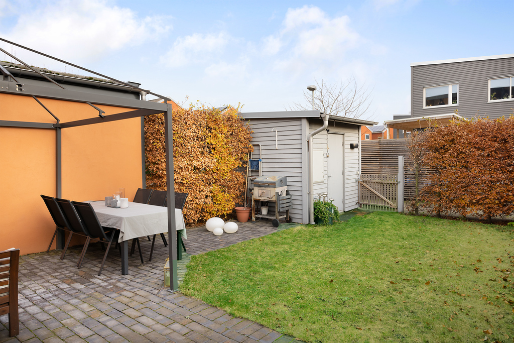 En egen och lättskött trädgård på baksidan där de stora ytorna är finns en fin stenlagd uteplats - under sommarhalvåret fungerar detta som en förlängning av huset, det givna stället att spendera lediga dagar och kvällar. Förutom uteplatsen hittar ni en lagom stor och grön gräsmatta, lagom för lek eller varför inte ett parti kubb, men även odlingslådor och planteringar för den som önskar. Avenbokshäckar ramar in och vid sidan huset finns ett rymligt förråd som har plats för allt som behövs för ett trivsamt husliv, Vid förrådet finns en grind som leder ut mot grönområdet på baksidan och den närliggande lekplatsen- en yta utan biltrafik dit barnen kan springa för att leka.