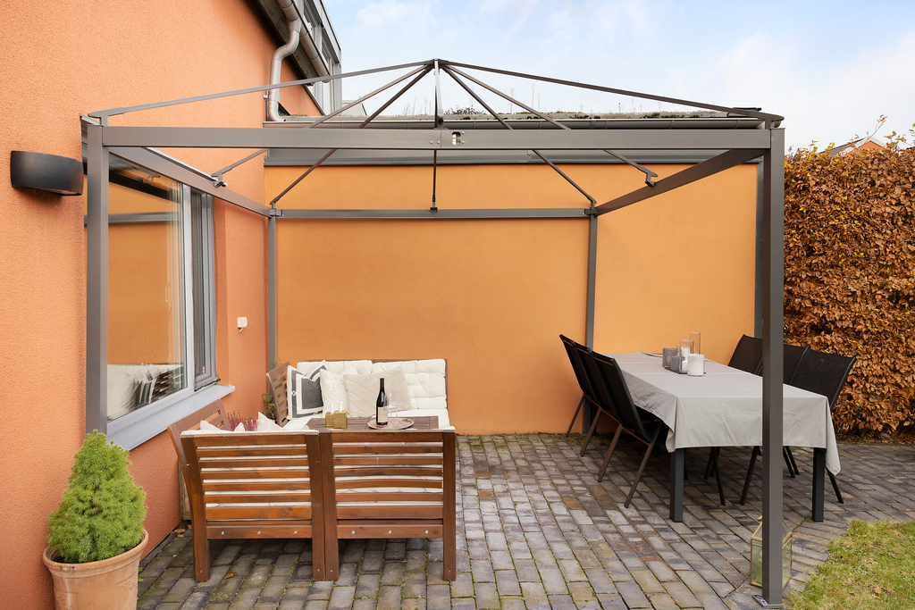 Inbjudande stenlagd uteplats planerad i vinkel för att njuta av långa sommardagar och härliga grillkvällar. Det finns gott om plats för både matbord och en loungehörna, vilket gör uteplatsen lika bra för måltider som för avkoppling. Uteplatsen nås direkt från vardagsrummet genom glasdörrarna och pergola finns för skydd mot både sol och regn.