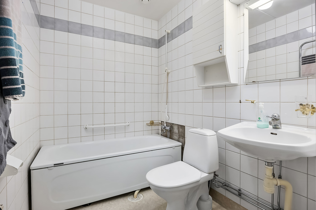 Badrum med kaklade väggar och plastmatta på golvet. Utrustat med badkar, handfat samt wc.