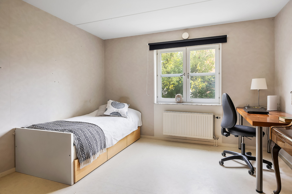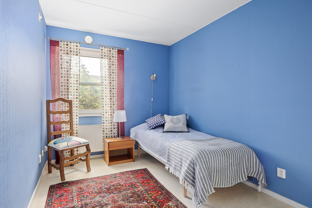Generöst tilltaget sovrum med bra ljusinsläpp från fönstret som vetter mot trädgården. Rummet rymmer enkelt dubbelsäng, skrivbord samt förvaringsmöbel.