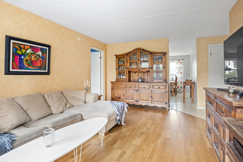Ljust och trivsamt vardagsrum med parkettgolv som enkelt går att möblera med soffgrupp samt matbord med stolar. Rummet ligger precis i relation till köket och ger access till den trivsamma trädgården.