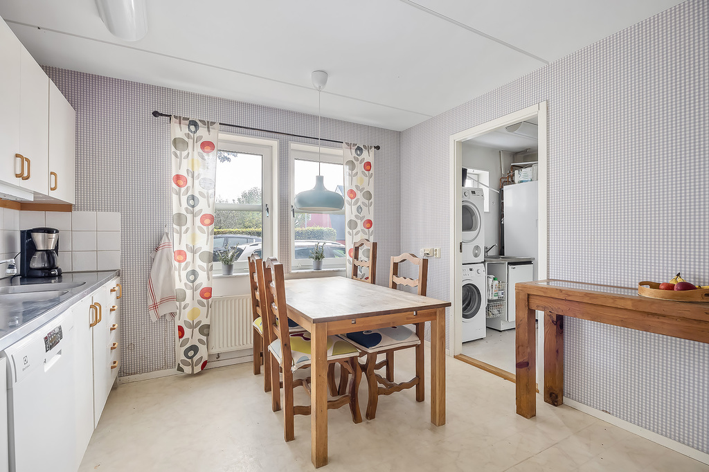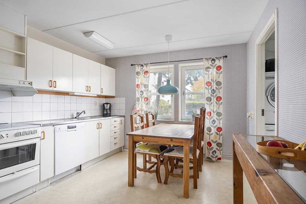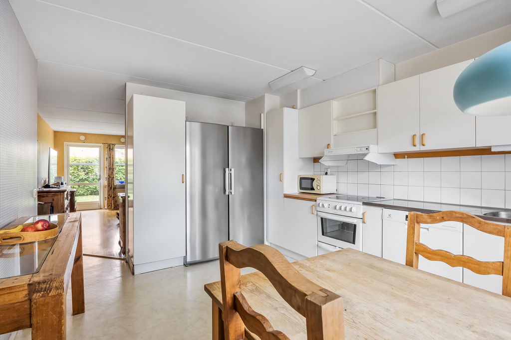 Köket erbjuder gott om utrymme för matlagning och umgänge, med plats för ett större matbord intill fönsterparti som ger ett naturligt ljusinsläpp. Förvaringsmöjligheterna är generösa med över- och underskåp längs hela arbetsytan, och det finns både diskmaskin och fullstor kyl och frys. Planlösningen är praktisk med direkt anslutning till vardagsrummet, vilket underlättar vardagen. Här finns en utmärkt bas för den som vill sätta sin egen prägel genom renovering.