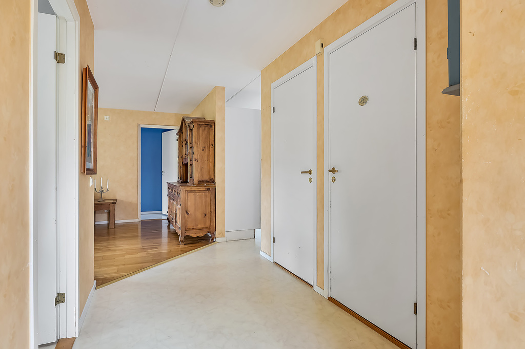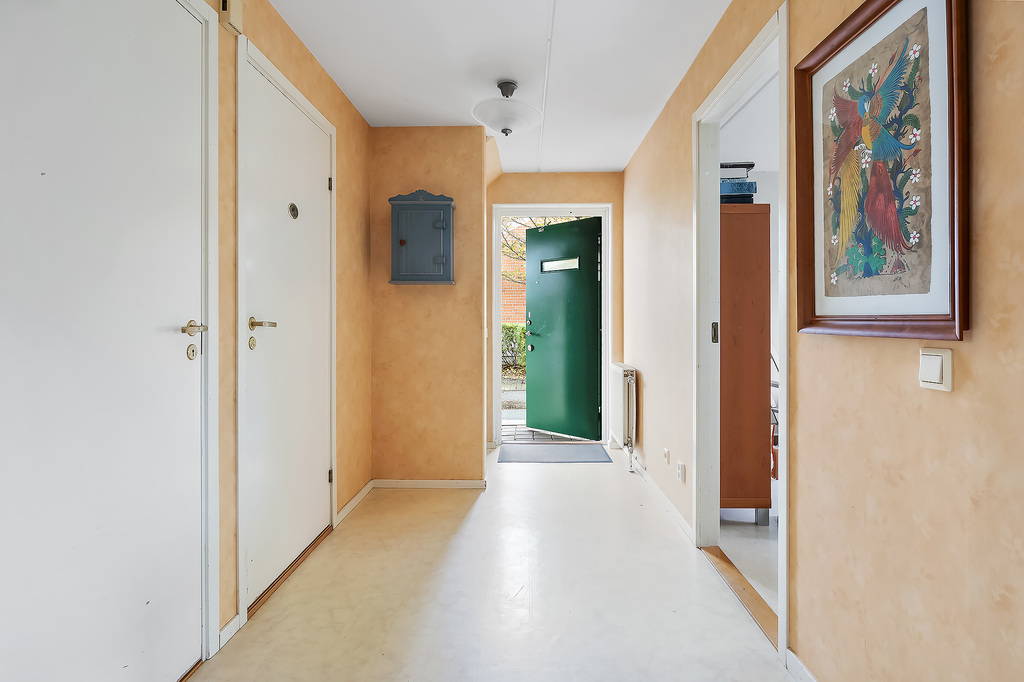 Välkomnande entré med egen ingång utifrån och plats för avhängning. Från hallen nås en klädkammare som löser förvaringen.