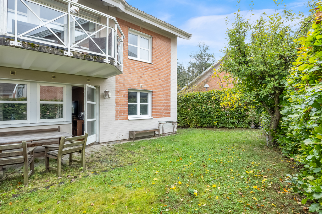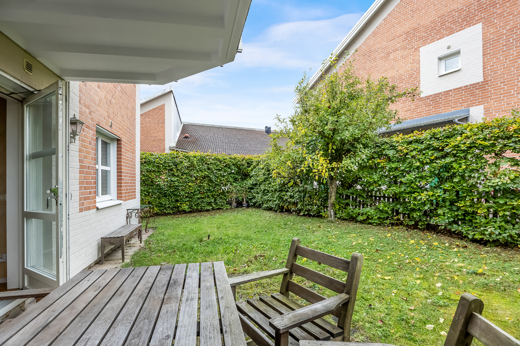 Med utgång från vardagsrummet nås en grönskande och insynsskyddad trädgård i härligt västerläge. Här erbjuds en generös uteplats med plats för både matgrupp och loungemöbler. Trädgården ramas in av tät häck och ett fint fruktträd. Den plana gräsmattan ger utrymme för odling, lek eller vidare utveckling för den trädgårdsintresserade.