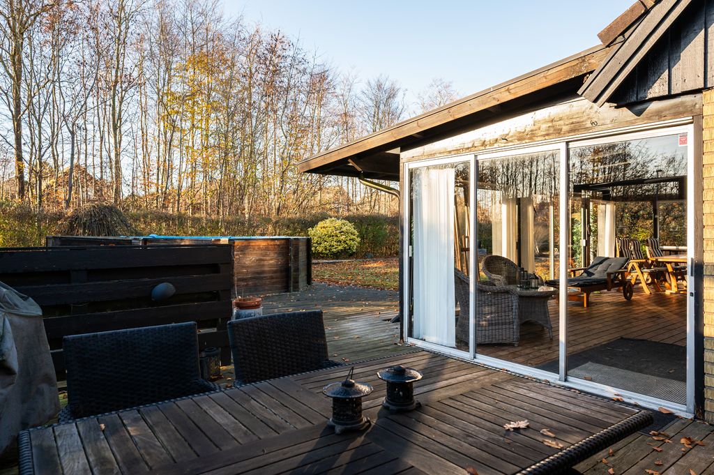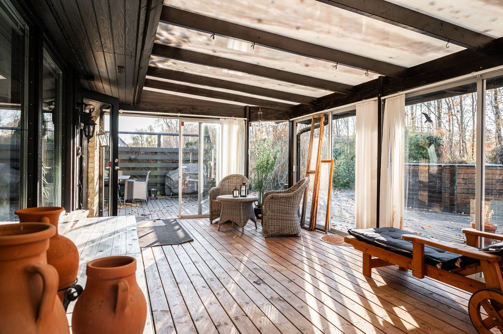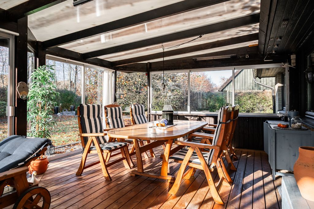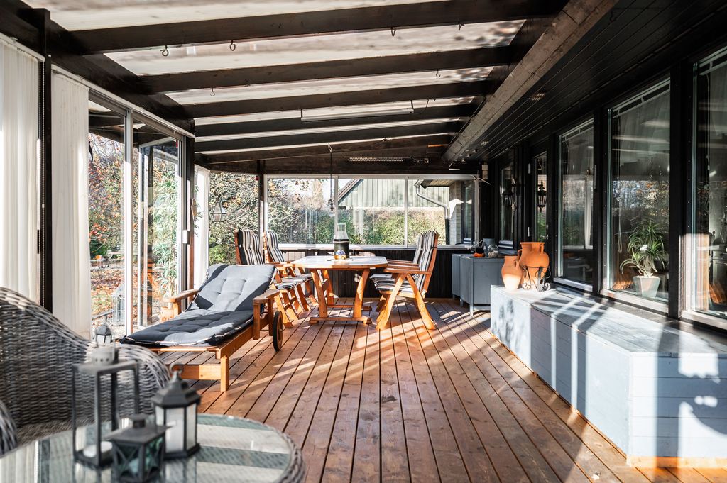 Stort och trivsamt uterum om 36,7 kvm. Skjutbara glaspartier som vetter mot trädgården kan öppnas upp och sudda ut linjen mellan ute och inne. Det transparenta taket släpper in rikligt med dagsljus. Här finns gott om plats för både matgrupp och loungemöbler, vilket gör rummet användbart stora delar av året. Uterummet nås både via grovköket och genom en utgång från vardagsrummet.