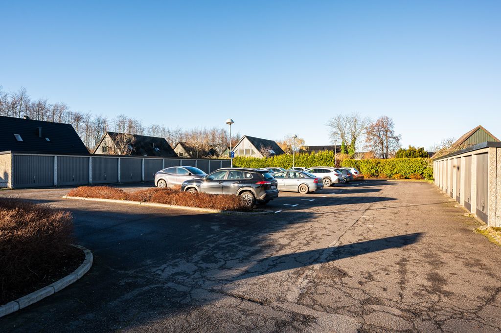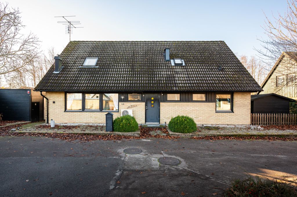 Välkomnande och lättskött framsida med formklippta buskar och stenkross som skapar ett prydligt intryck. Huset är beläget ett stenkast från garage och parkeringsplatser, vilket ger bekväma parkeringsmöjligheter inom nära avstånd. Husets huvudentré nås från framsidan och runt gaveln nås trädgården där det finns en ingång till grovköket via uterummet.