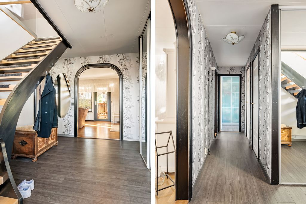 Välkomnande hall med ett fint ljusflöde från vardagsrummet som skapar en ljus och luftig känsla. Hallen är L-formad och knyter samman bostadens centrala delar - kök, vardagsrum, två sovrum, badrum samt ett förråd som tidigare nyttjats som toalett. Golvet är klätt i laminat och väggarna är tapetserade. Vid entrén finns en praktisk garderob med skjutdörrar och längre in i hallen ligger en rymlig klädkammare som erbjuder goda förvaringsmöjligheter.