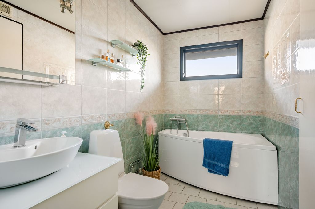 Ljust och helkaklat badrum som får in ett fint ljusflöde. Golvet är klätt med ljus klinker och väggarna är klädda i kakel med ljusa toner upptill och gröna toner nedtill. Här finns hörnbadkar, wc, kommod med handfat, spegel samt ett inbyggt förvaringsskåp.