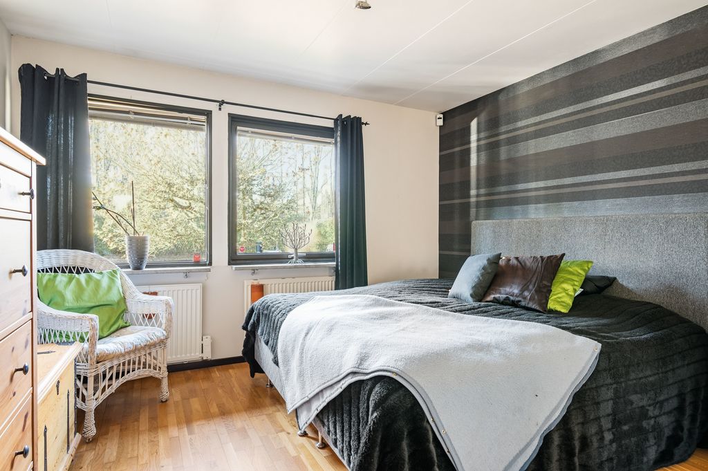 Rymligt sovrum med två fönster ut mot trädgården. Här finns plats för en större säng med tillhörande sängbord. En inbyggd garderob med skjutdörrar, varav en med spegel, erbjuder praktisk förvaring och förstärker känslan av rymd. Rummet har parkettgolv och tapetserade väggar, varav en fondvägg som ger karaktär.