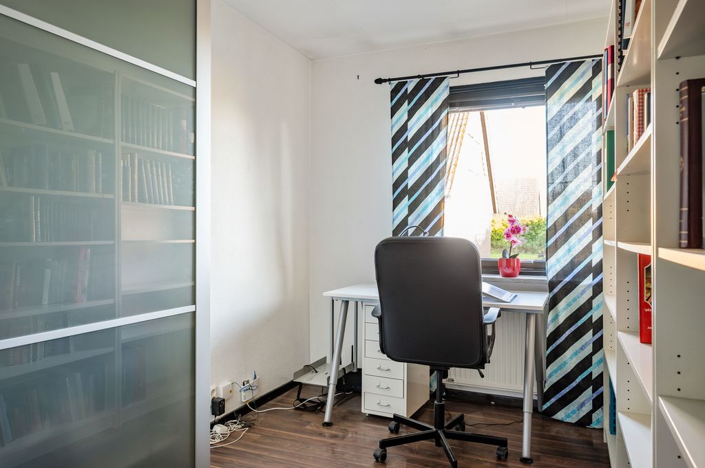 Ett mindre sovrum som lämpar sig väl som barnrum, arbetsrum eller gästrum. Rummet har laminatgolv och tapetserade väggar i vitt, vilket ger en ljus och neutral bas. Här finns en garderob med skjutdörrar.