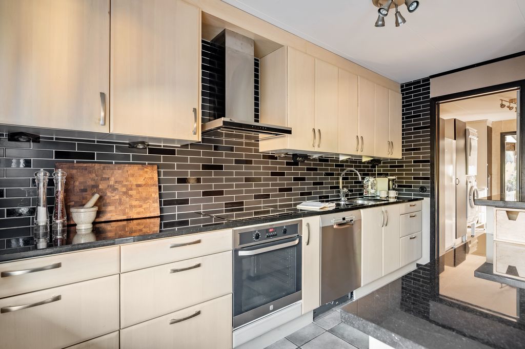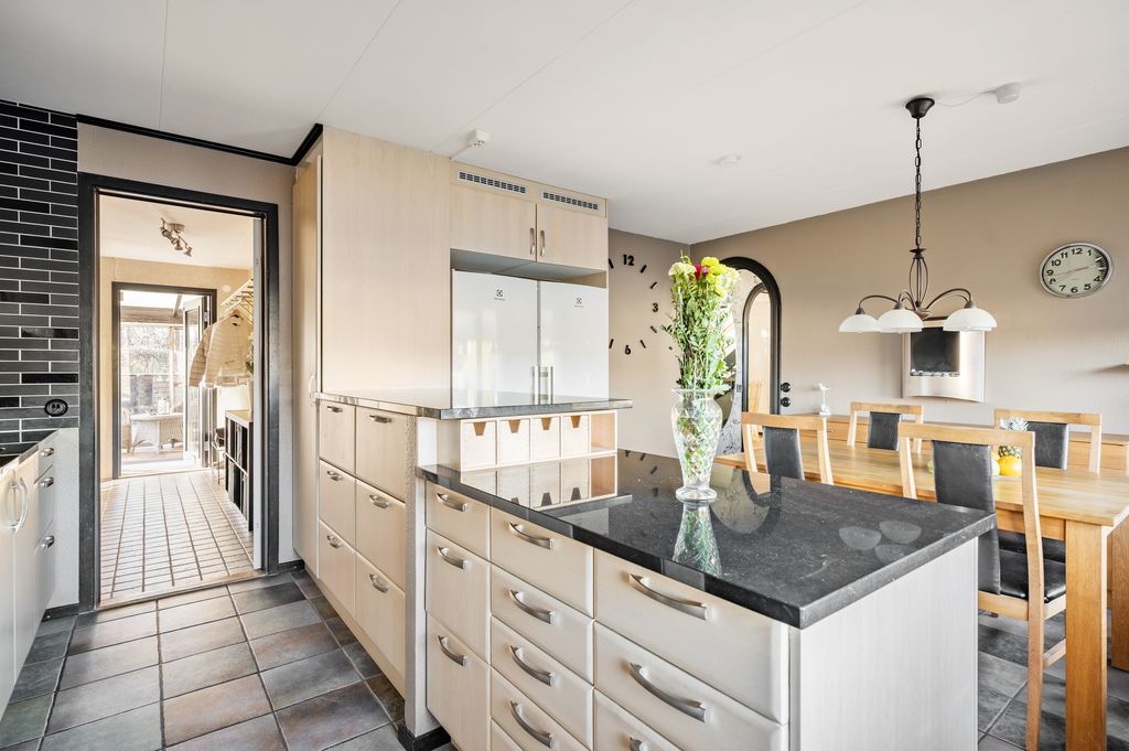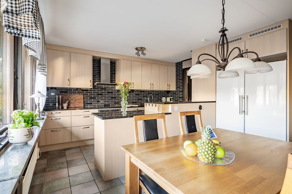 Stort och välplanerat kök med gott om arbetsytor och förvaring. Köket är utrustat med ljusa skåpsluckor, svart kakel i liggande förband samt bänkskivor i svart granit som ger en elegant kontrast. Den generösa köksön erbjuder extra arbetsyta och förvaring. Intill de stora fönstren finns plats för ett matbord för 4–6 personer. Köket har klinkergolv och väggarna är klädda med målade tapeter. Vidare från köket nås grovköket.