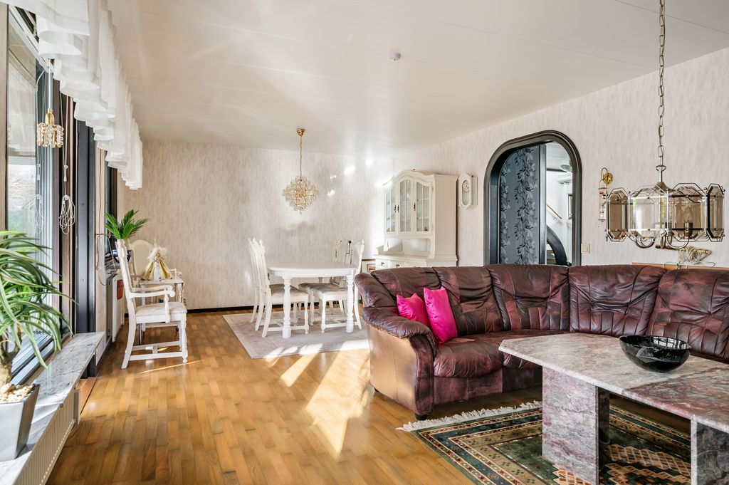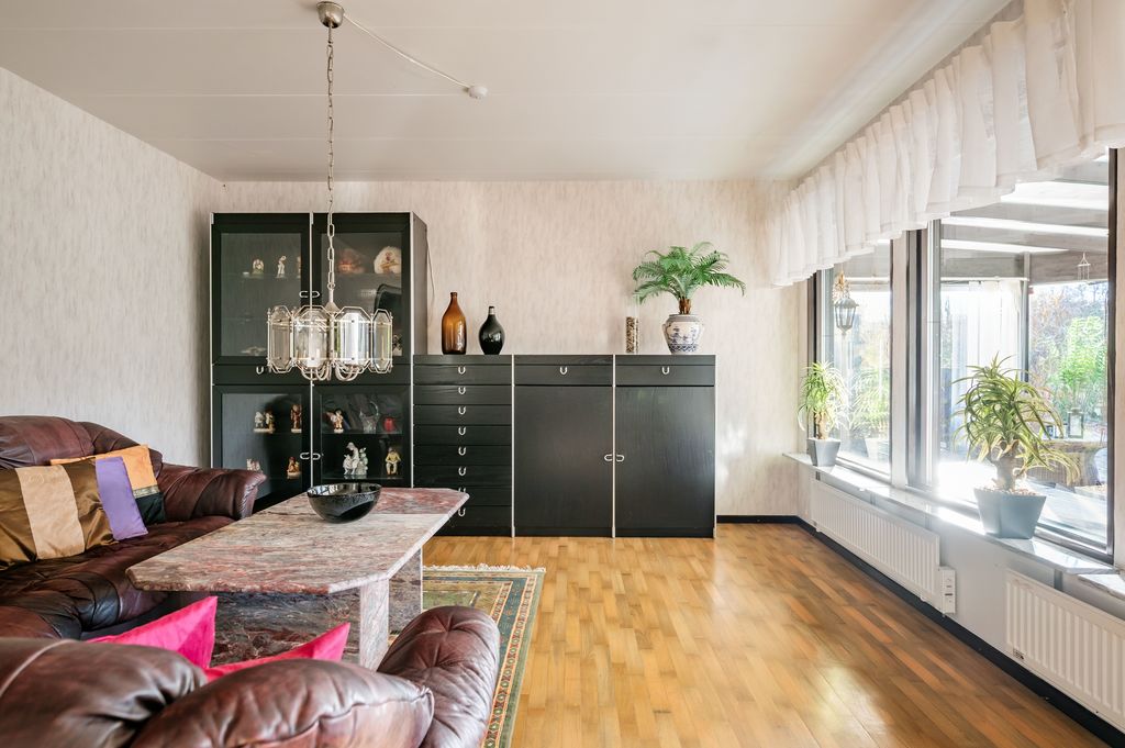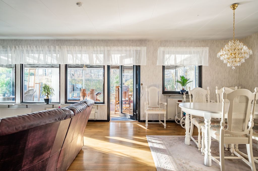 Vardagsrummet nås rakt fram från hallen och erbjuder en generös yta med plats för både större soffgrupp och matmöbler. De stora fönsterpartierna vetter mot uterummet och släpper in rikligt med naturligt ljus. En glasad dörr leder direkt ut till uterummet, vilket skapar en naturlig förbindelse mellan inne och ute. Vardagsrummet har parkettgolv och tapetserade väggar.
