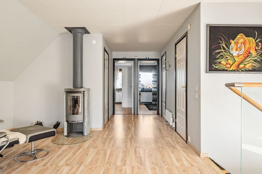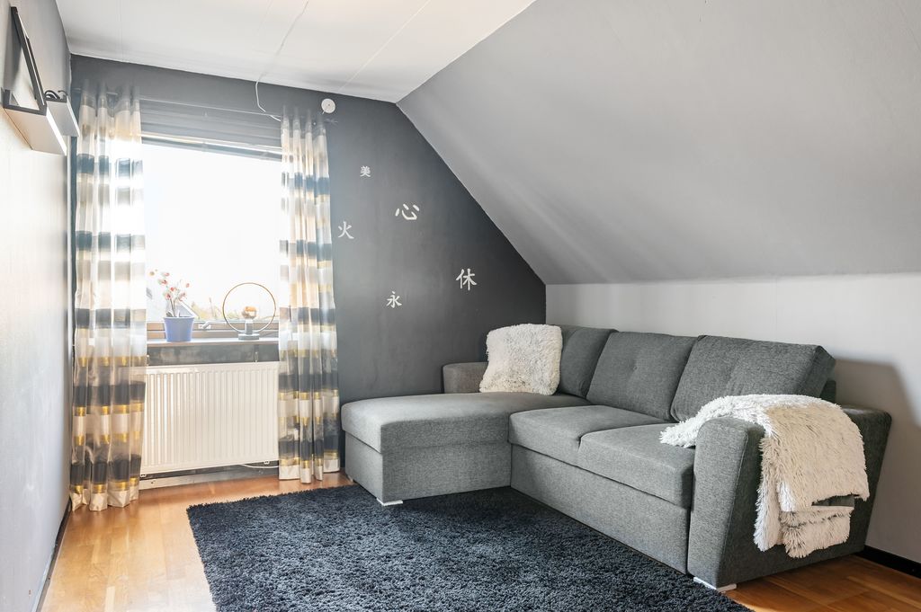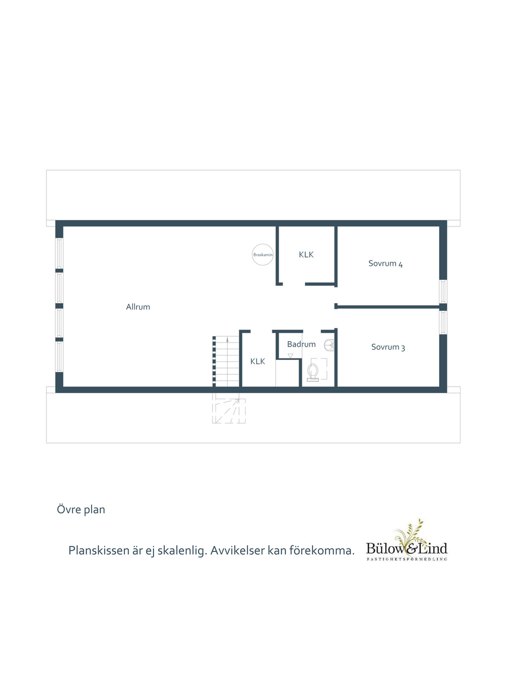 På övre plan möts ni av ett stort och ljust allrum. Här finns gott om plats för soffgrupp, tv-möblemang eller annan flexibel möblering efter behov. En braskamin ger både värme och trivsel under årets kallare månader. Rummet har laminatgolv och ljusa väggar. Härifrån når ni två klädkammare samt lucka upp till vinden.
