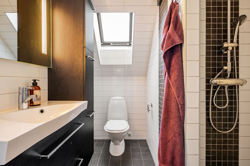 Smakfullt renoverat badrum med kaklade väggar i vitt och mörkare klinkergolv. Rummet är utrustat med duschhörna, WC, kommod med handfat, spegel och förvaringsskåp. Ett takfönster släpper in naturligt ljus.