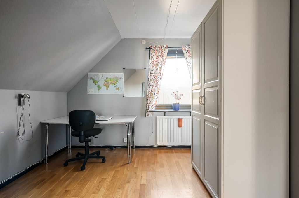 Detta sovrum är lika stort till ytan och kan enkelt möbleras med både säng och skrivbord. Här finns dessutom en garderob. Väggarna är klädda med målade tapeter och golvet är klätt med parkettgolv.