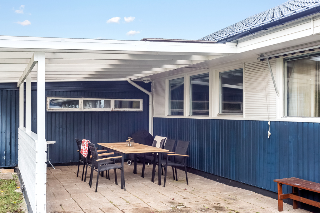 Skön uteplats under tak belägen utanför stora sovrummet. Mysig plats som skyddar från regn och sol.