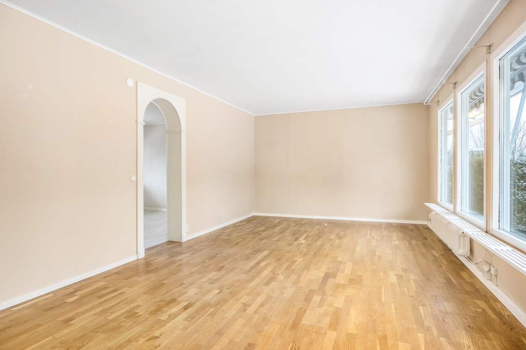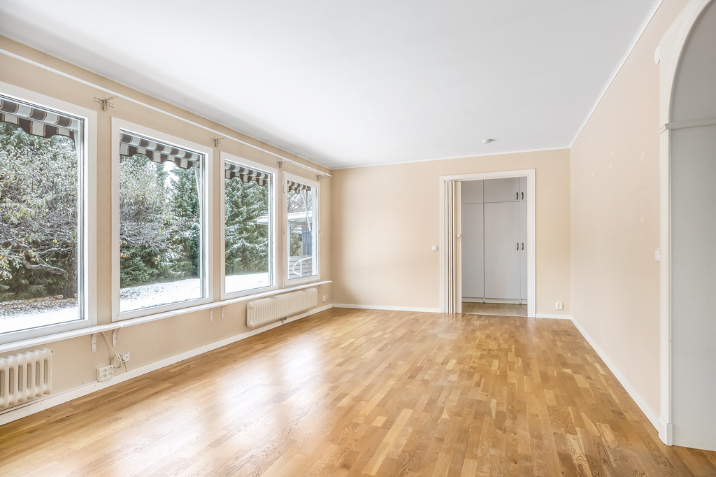Stort rum med ekparkett. Fönster längs hela väggen mot trädgården. Här får man plats med både soffgrupp och matsalsmöbel. Lugn och rofylld vy över den slutna trädgården.