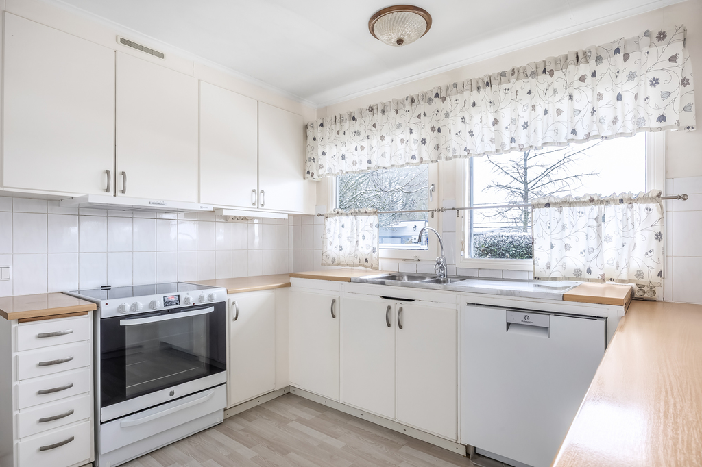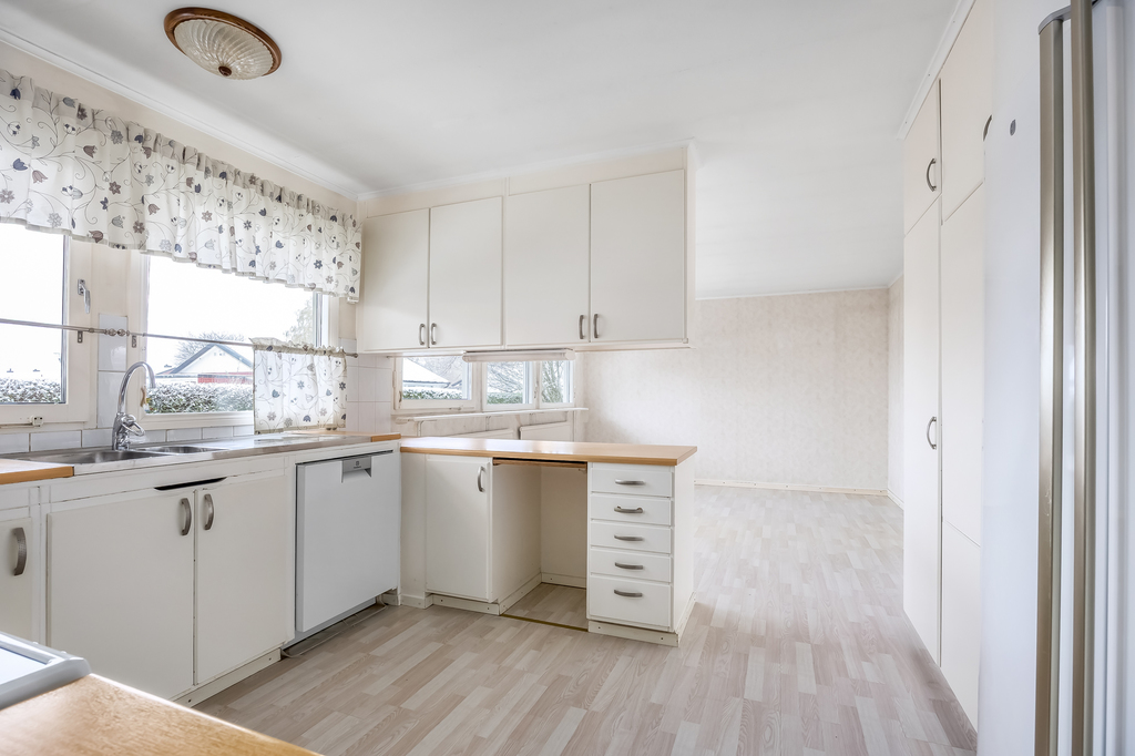 Stort kök med vita luckor och stommar. Hällspis med fläkt av senare datum, diskmaskin. Nyare kyl och frys "side by side". Stort fönster mot gatan. Köket hänger ihop med matplatsen och man har kontakt med de sittande genom de klassiska hängande skåpen som är öppna nedtill.