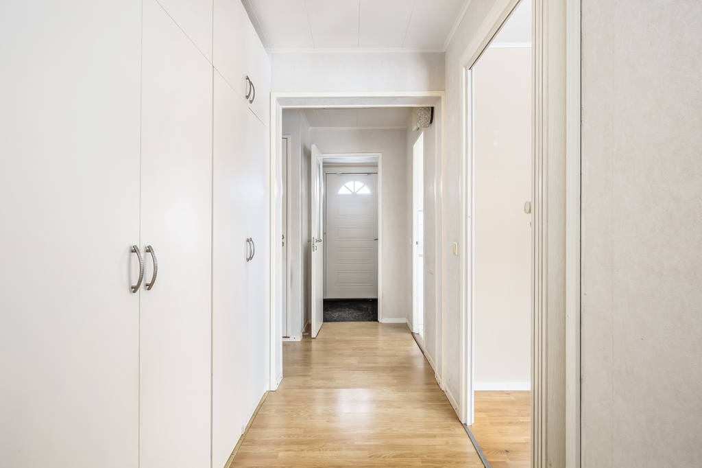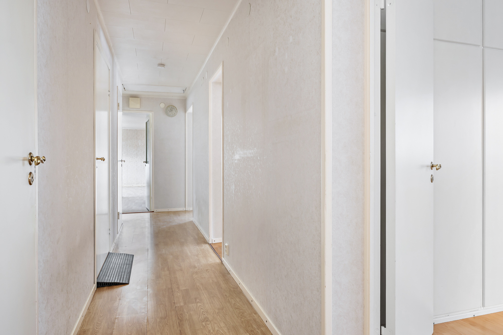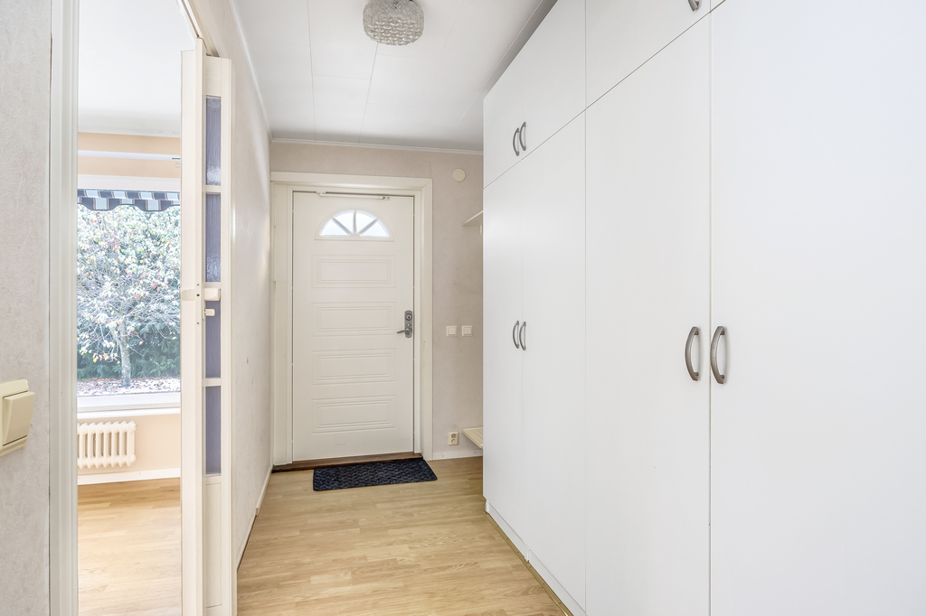 En hall centralt belägen i huset. Huset har två huvudingångar en från gatan och en från gårdssidan. Tre stora garderober så man kan gömma allt som inte behöver stå framme.