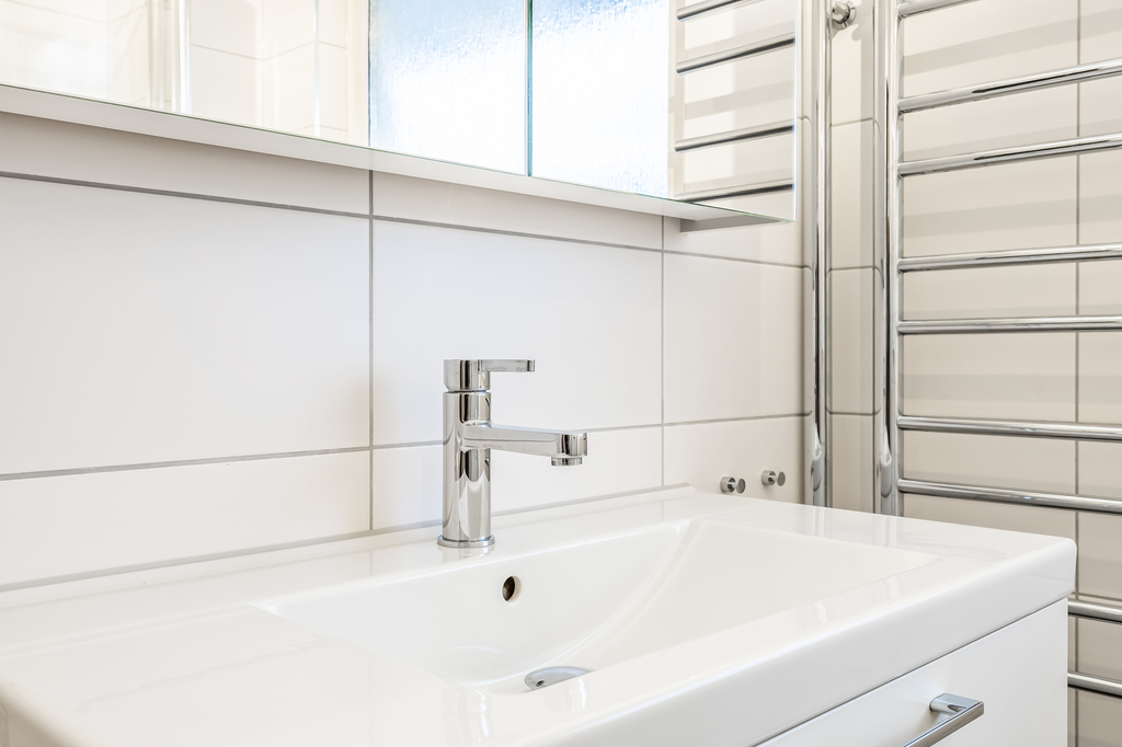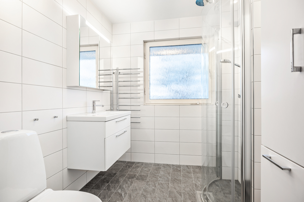 Ett mycket fräscht badrum från 2018. Det finns papper på badrummet och det ser mer eller mindre helt nytt ut. Golvvärme på el och duschhörna med glasväggar. Handdukstork och rejält skåp för förvaring.
