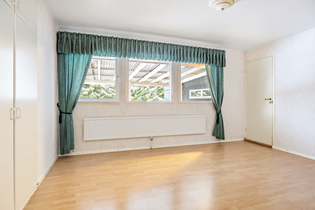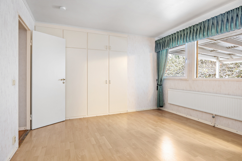 Stora sovrummet ligger med utsikt mot behaglig grönska mot bakgården. Ett kvadratisk rum med stora fönster och laminat på golvet. Flera garderober.