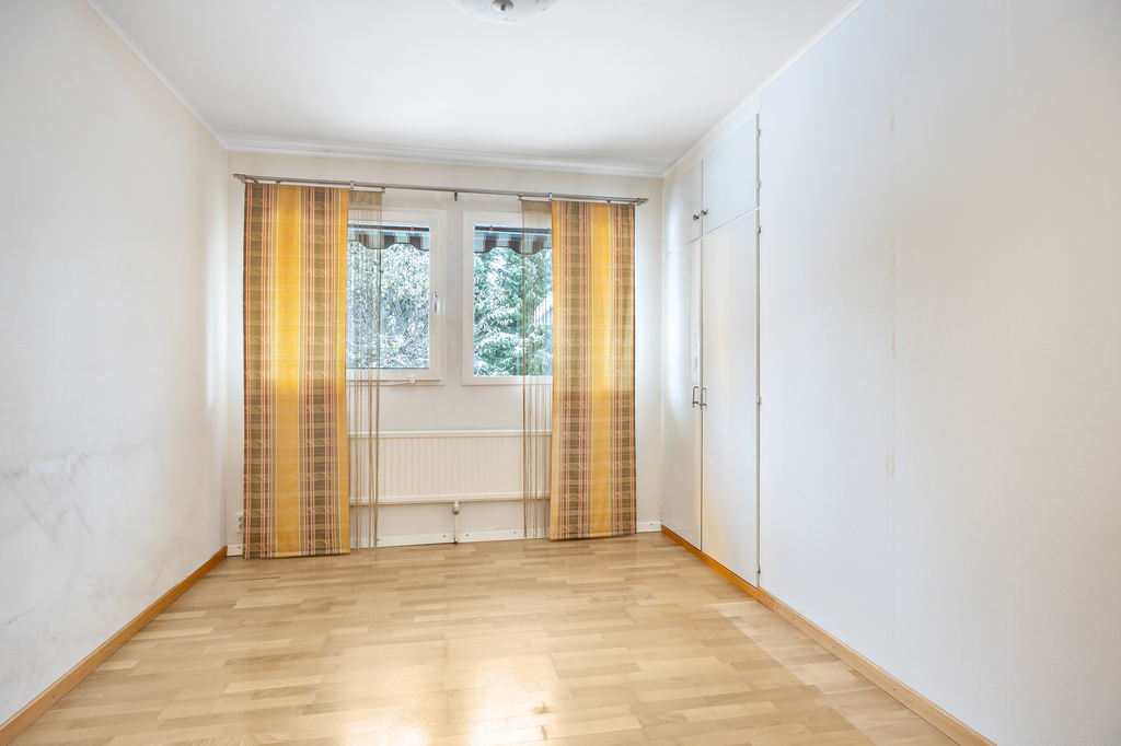 Sovrum 2 och 3 är nästan identiska i storlek och utformning. Det som skiljer de två är att det ena vetter mot gatan och det andra mot trädgården. Två garderober i vardera rummet.