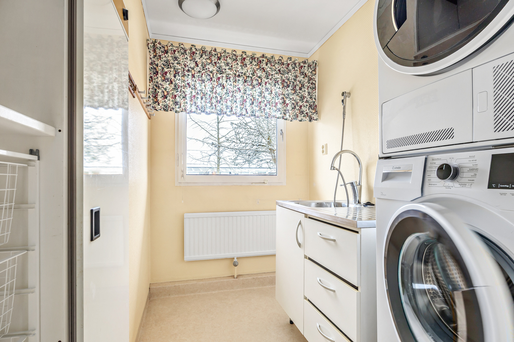 Tvättstuga med nyare maskiner - både tvättmaskin och torktumlare av nyare slag (Cylinda).