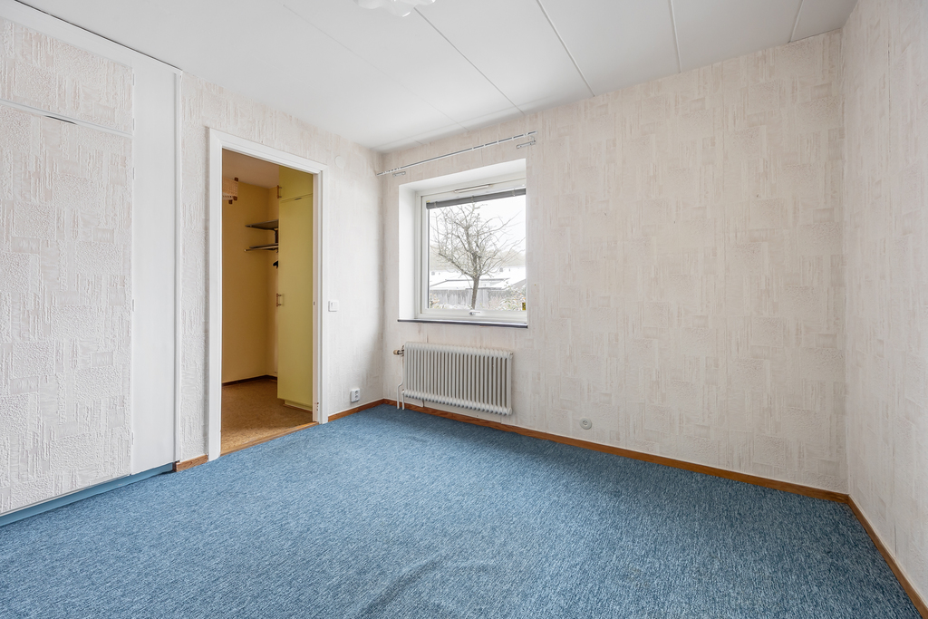 Till vänster från entréhallen ligger husets första sovrum. Ett trevligt rum i bra storlek med plats för dubbelslängen och med inbyggda garderober som ger fina förvaringsutrymmen. Heltäckningsmatta på golvet, ljusa tapetserade väggar och stort fönster mot husets framsida.