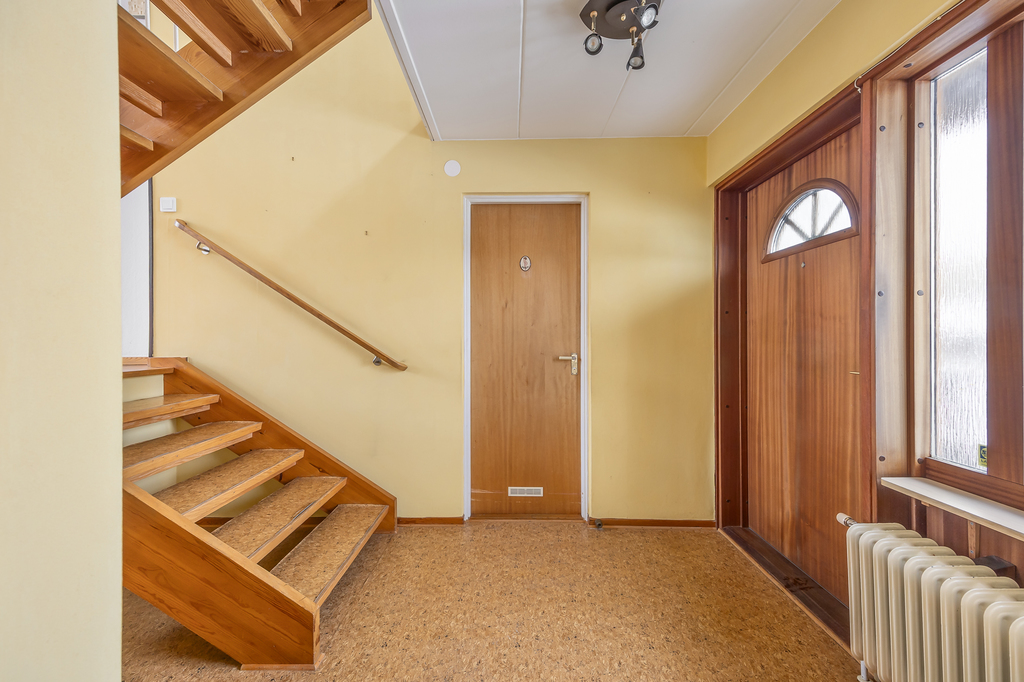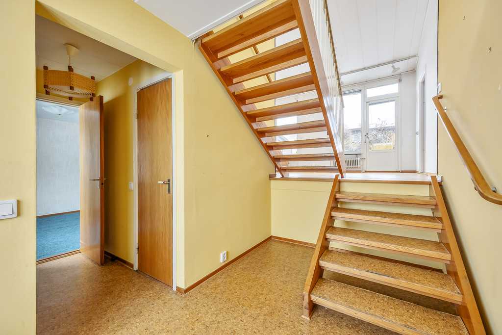 Entréhallen välkomnar in genom ytterdörr med halvmåneformat fönster och sidoljus. Praktisk plastmatta på golvet, gula väggar väggar och generösa förvaringsytor i både två dubbla inbyggda garderober och en rymlig klädkammare. Här ryms ytterkläder och skor lätt utom synhåll och det finns dessutom gott om plats för mer. En trappa leder vidare en halv nivå upp till vardagsrummet och sedan ytterligare en nivå upp till de två sista sovrummen.