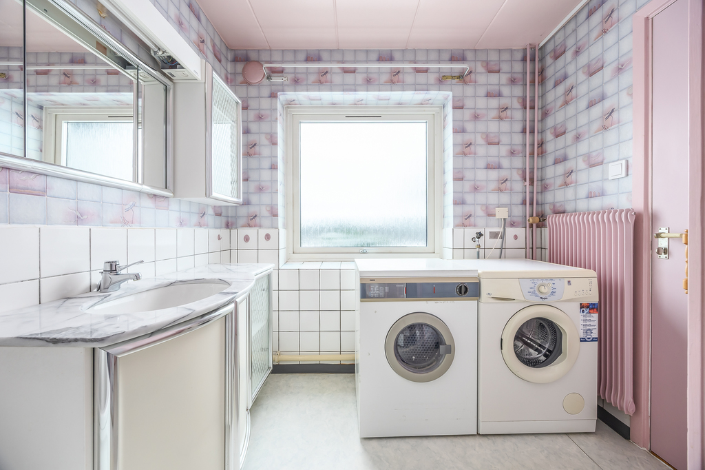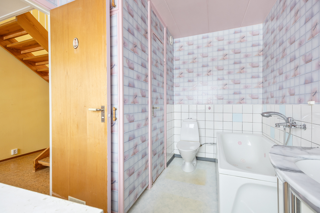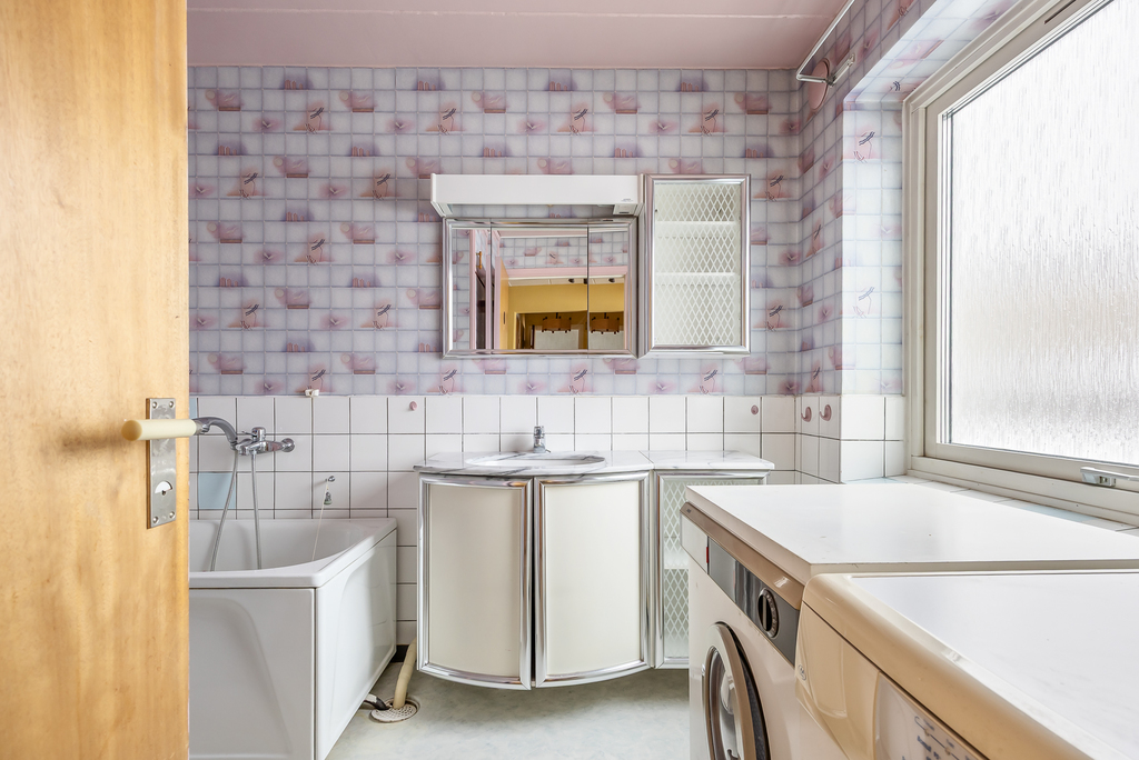 I entréplan ligger även badrummet - väl tilltaget och faktiskt med möjlighet att bli ännu större i och med den inbyggda garderoben/pannrummet som i vissa grannhus har tagits minskats ner för att ge en större badrumsyta. Halvkaklade väggar med våtrumstapet ovanför och ljus våtrumsmatta på golvet. Wc, handfat med stor kommod som har fin avställningsyta på sidan och badrumsskåp med spegel ovanför. Tvättmaskin och torktumlare och ett stort fönster med frostad ruta som släpper in dagsljuset utan att tillåta insyn.