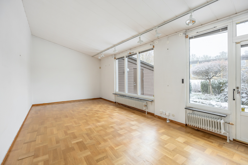 En halv trappa upp från entrén öppnar ett luftigt vardagsrum upp med fantastiska fönsterpartier där södersolen strömmar in och dörr rakt ut till trädgården. Här låter man gärna dörren stå öppen de vackra dagarna under sommarhalvåret och låter trädgården ingå i sällskapsytorna. Härligt ljus och rymd tack vare den sköna takhöjden och gott om plats för både matbord och soffgrupp. Smidig kontakt med köket som ligger vägg i vägg, vita väggar och parkettgolv.