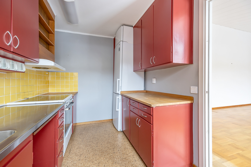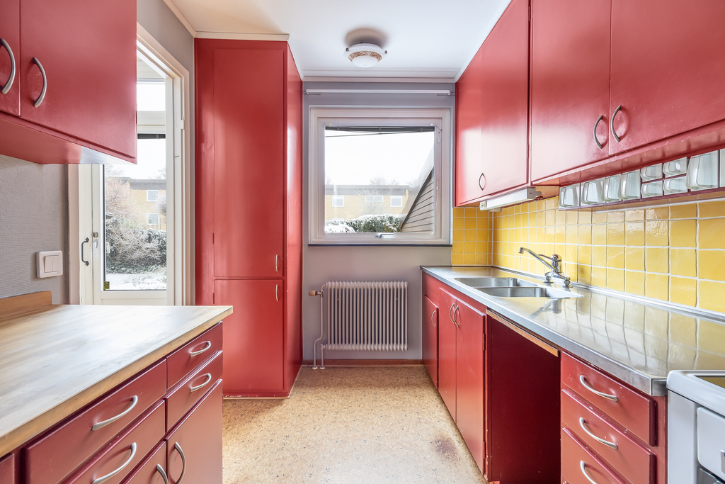 Praktisk utformat kök med både fina arbetsytor och gott om skåpsutrymme. Inredning i rött, rostfri bänkskiva som kombineras med bänkskiva i trä samt kakel i soligt gult ovanför. Kyl/frys, spis med häll och spisfläkt. Fönster mot trädgården på husets baksida, ljusgrå väggar och plastmatta på golvet.