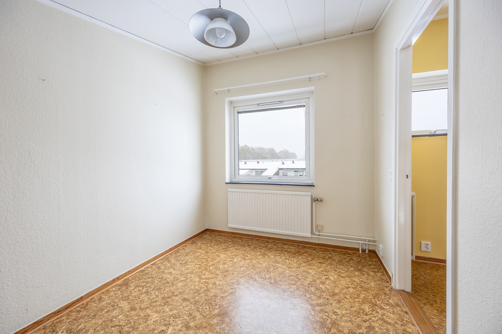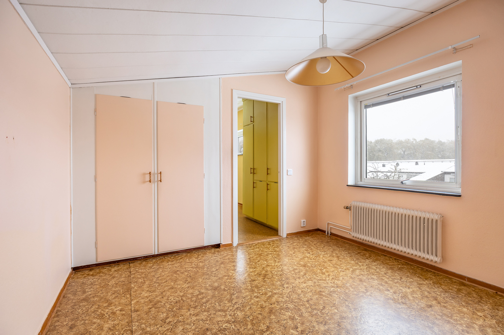 På andra sidan hallen ligger ett  stort sovrum - även det med fönster mot husets framsida med fri och grönskande utsikt. Här inne finns inbyggda garderober, samma plastmatta som i grannrummet och väggar i rosa.