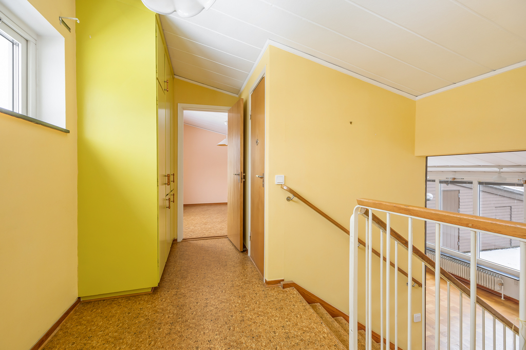 Den övre hallen är nätt med fönster ut mot husets framsida, inbyggda garderober, dörr till toaletten och plats för ytterligare mindre möblemang. Gula väggar och plastmatta även här.