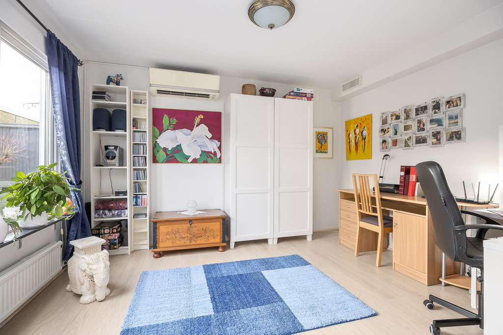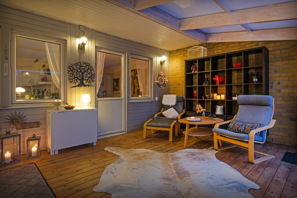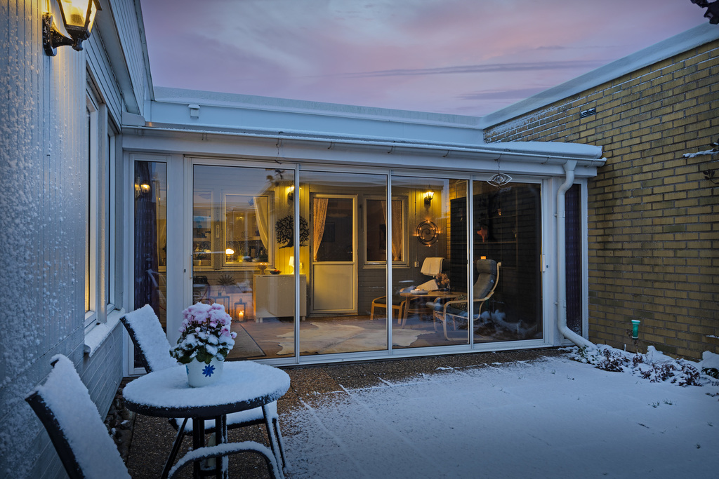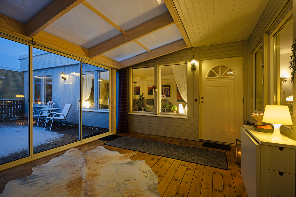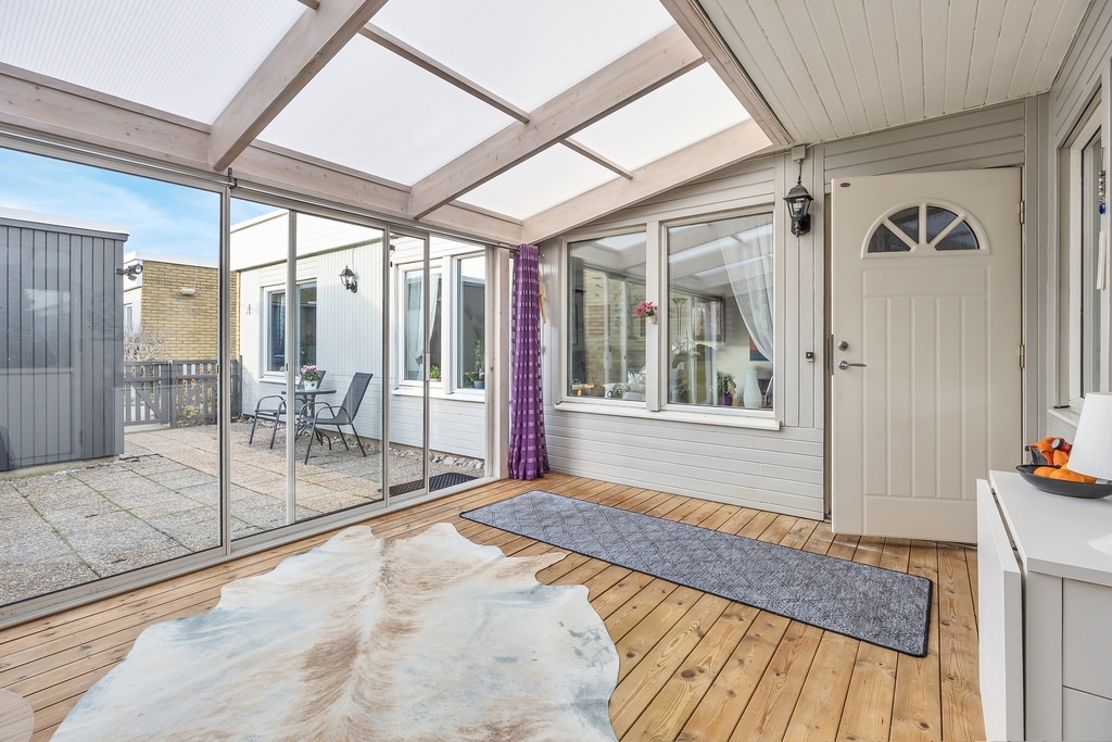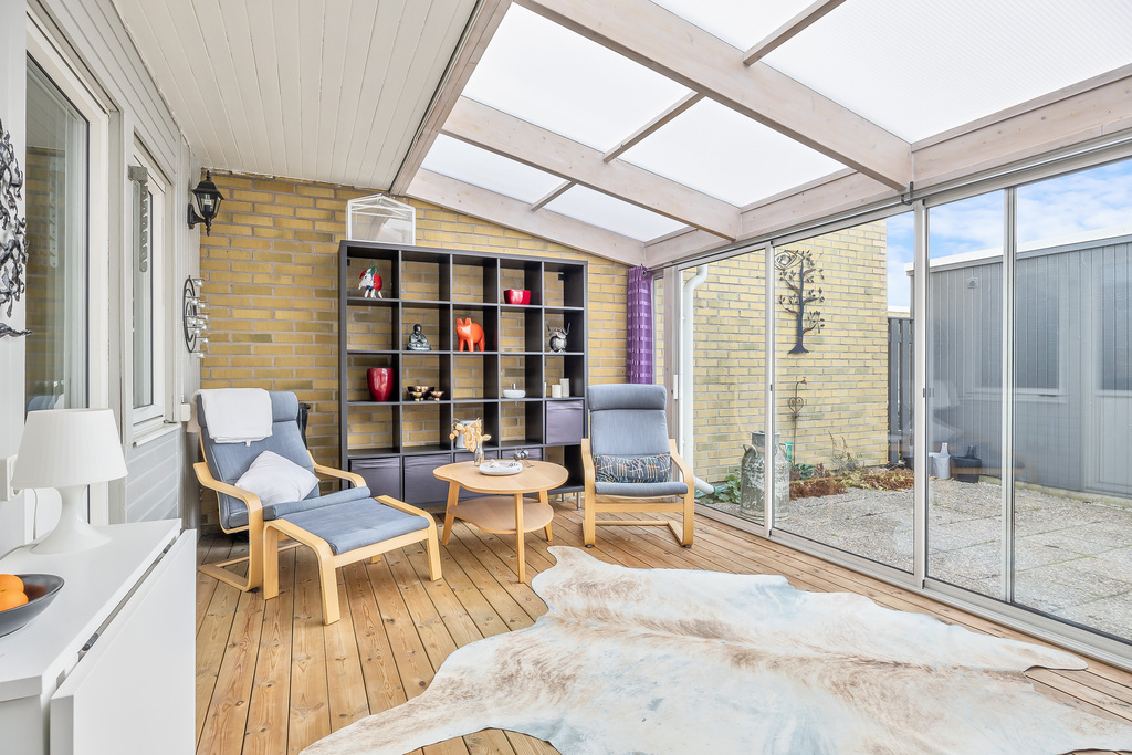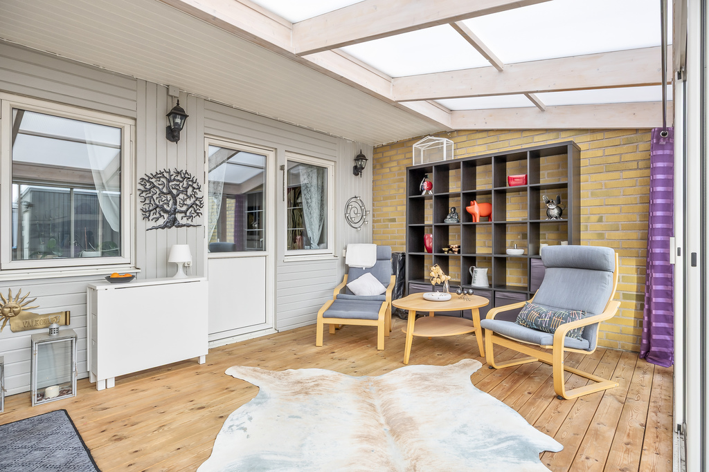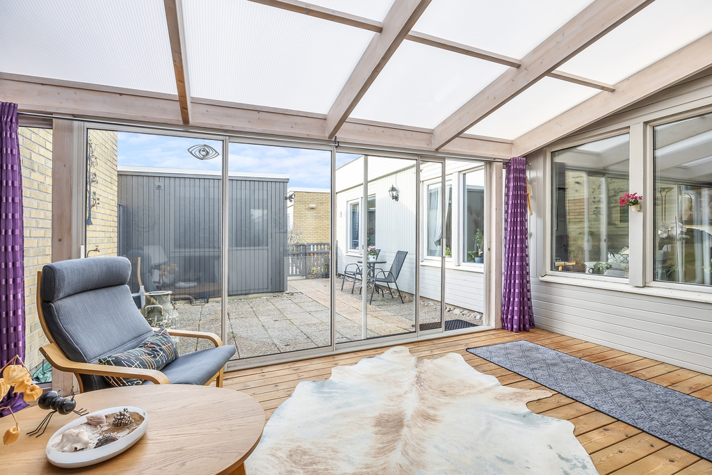 Ett härligt rum som fungerar som ett extra vardagsrum, Ljus kommer från taket och den glasade väggen mot uteplatsen. På sommaren kan man öppna upp den främre glasväggen.