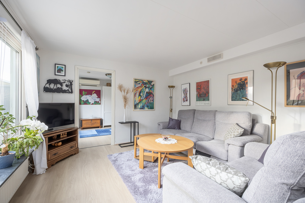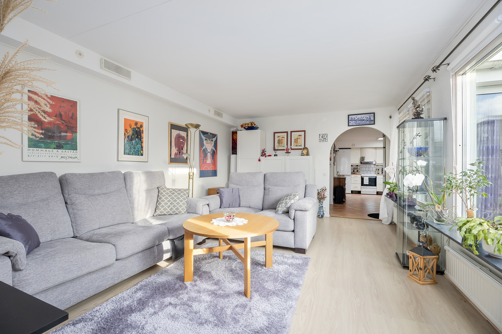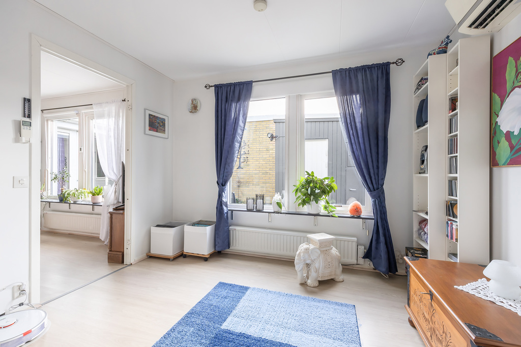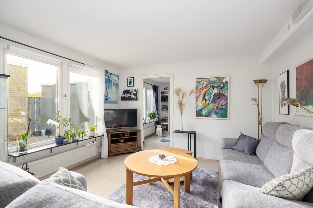 Vardagsrummet är inbjudande med generösa fönsterpartier som fyller rummet med naturligt ljus och ger en trevlig vy mot den egna uteplatsen. Det ljusa golvet löper enhetligt vidare in i ett av sovrummen och bidrar till en harmonisk helhet. Väggar och tak är målade i vitt, vilket lyfter rummet och förstärker den luftiga känslan.
